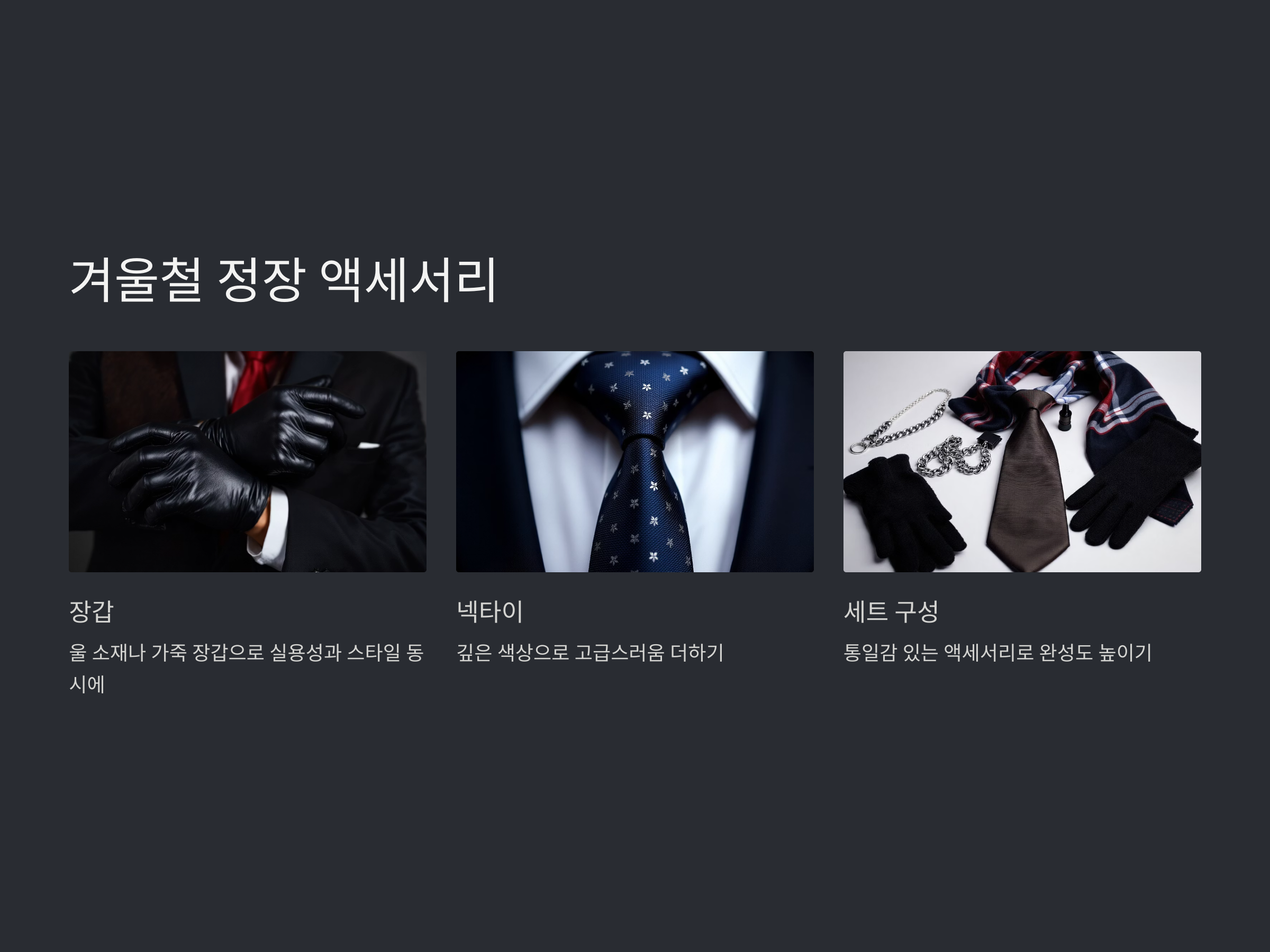 겨울철 정장 코디에서 액세서리는 스타일을 결정짓는 중요한 역할을 합니다. 추운 날씨에도 코디를 완성도 있게 만드려면 겨울철 액세서리로는 장갑과 넥타이를 빼놓을 수 없습니다. 겨울철 액세서리는 실용성과 스타일을 동시에 고려해야 하므로, 무난한 디자인의 장갑을 선택하는 것이 좋습니다. 울 소재나 가죽 장갑은 스타일리시하면서도 보온성을 제공합니다.