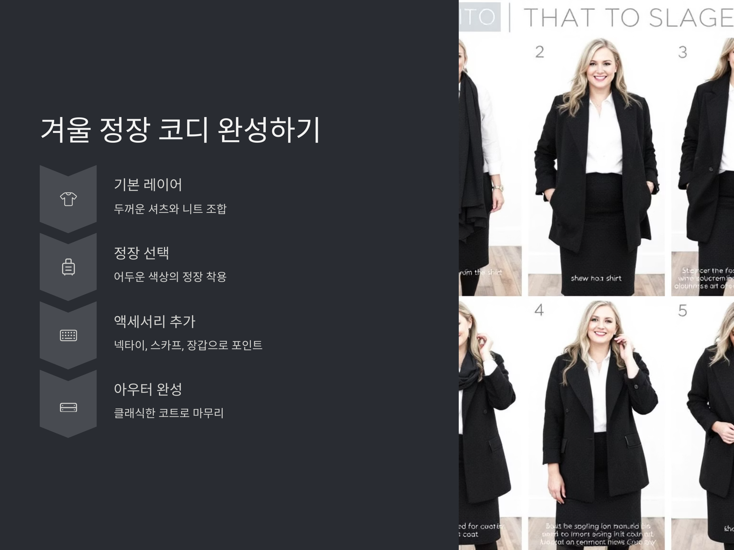 겨울철 한파를 대비한 정장 코디는 충분히 실용적이고 세련된 스타일을 연출할 수 있습니다. 각종 아이템을 조화롭게 매치하여, 중요한 자리에서 언제나 자신 있게 등장할 수 있도록 준비해보세요.