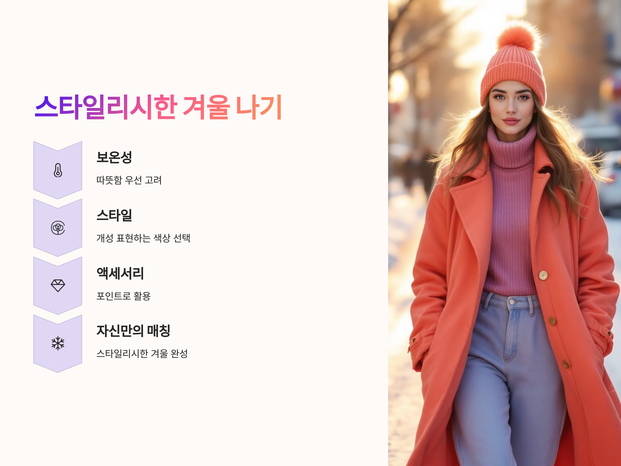 - 브라운, 베이지: 자연적인 느낌을 줄 수 있는 색상으로, 한파에 적합한 포근한 인상을 줍니다. 베이지색은 모던하면서도 따뜻한 분위기를 연출할 수 있어 겨울철 겨울 코트나 패딩과 잘 어울립니다.