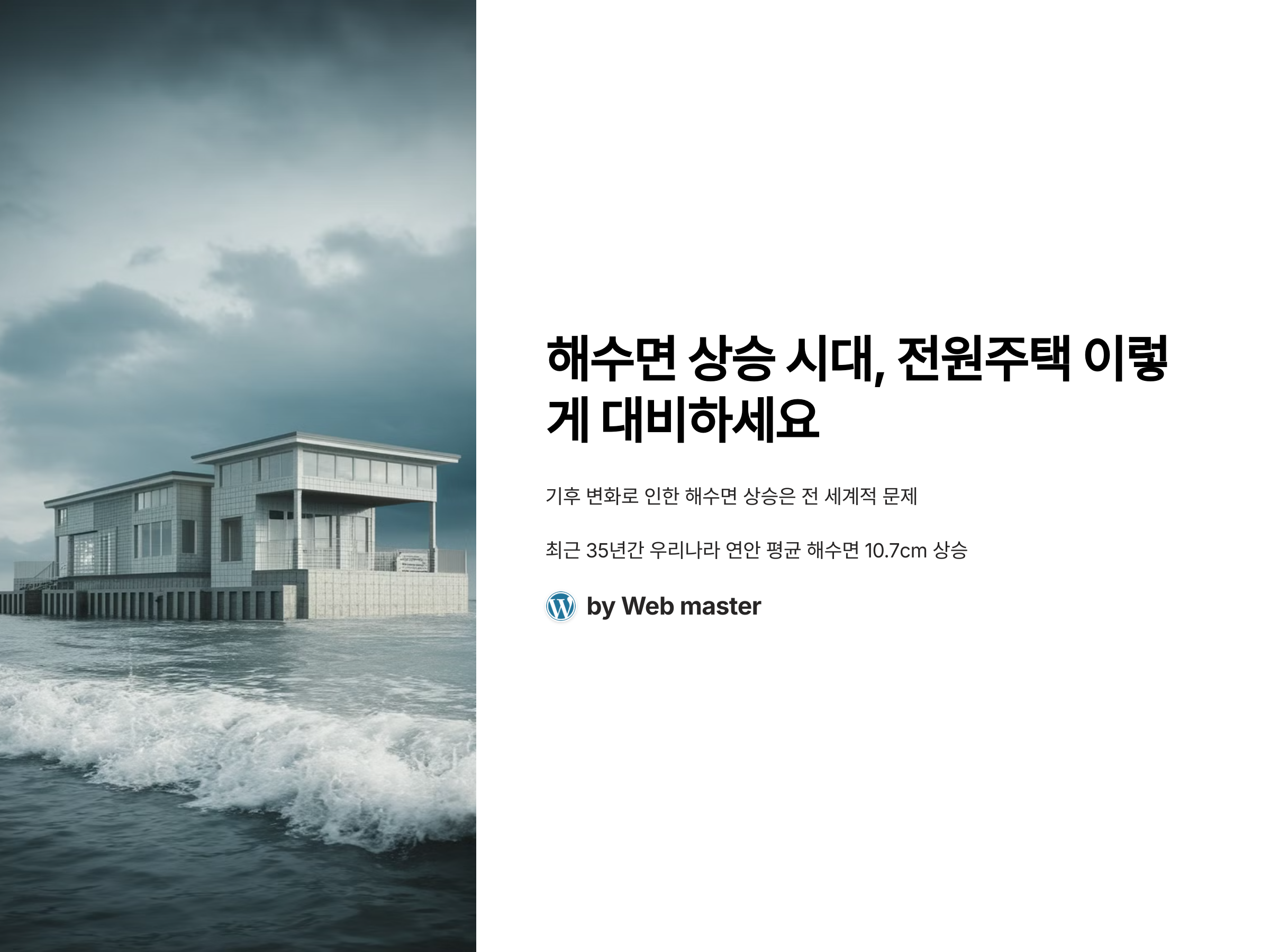 기후 변화로 인한 해수면 상승은 전 세계적으로 심각한 문제로 대두되고 있습니다. 특히 해안 지역에 위치한 전원주택은 이러한 변화에 직접적인 영향을 받을 수 있습니다. 따라서 해수면 상승에 대비한 전원주택의 설계와 관리는 필수적입니다. 최근 35년간 우리나라 연안의 평균 해수면이 10.7cm 상승하였으며, 이러한 추세는 가속화되고 있습니다. citeturn0search3