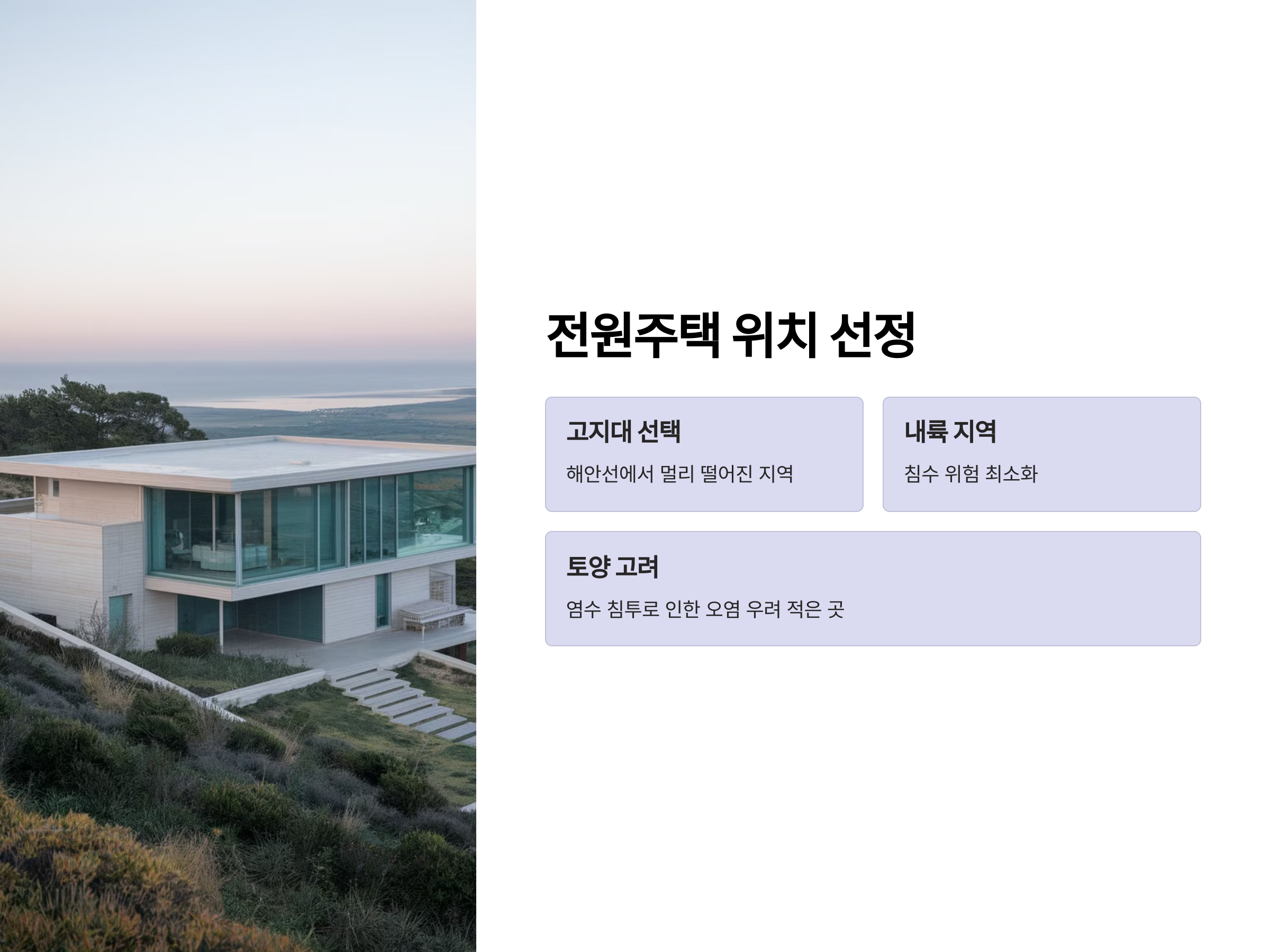 전원주택을 계획할 때 가장 중요한 요소 중 하나는 위치 선정입니다. 해안선에서 멀리 떨어진 고지대나 내륙 지역을 선택함으로써 해수면 상승으로 인한 침수 위험을 최소화할 수 있습니다. 이러한 지역은 침수 위험이 낮을 뿐만 아니라, 염수 침투로 인한 토양 오염의 우려도 적습니다.