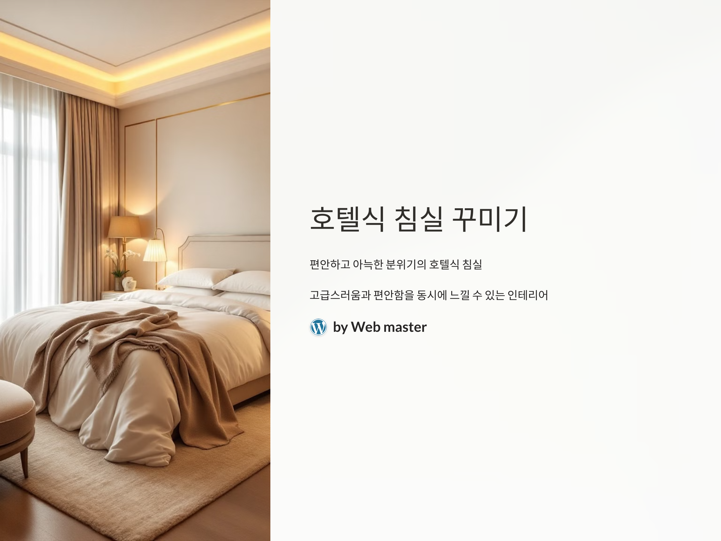 이렇게 몇 가지 요소를 조화롭게 꾸미면, 집에서도 호텔처럼 고급스럽고 아늑한 침실을 만들 수 있습니다.