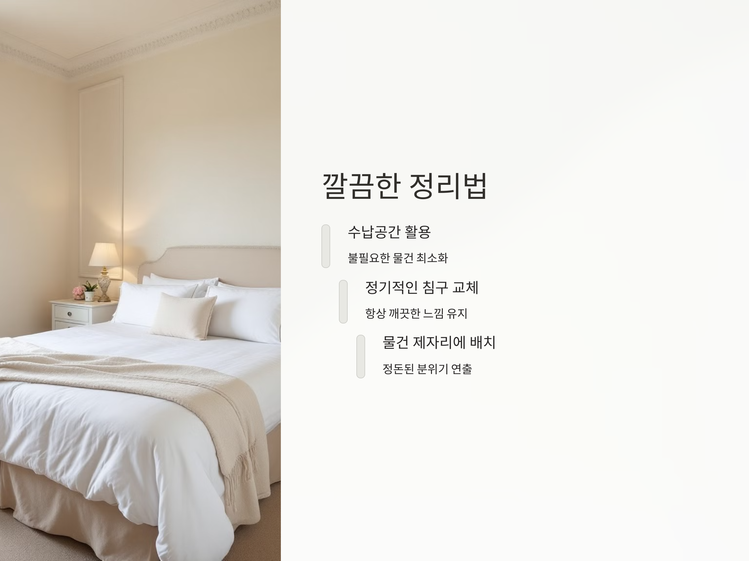 마지막으로, 호텔식 침실을 완성하기 위해서는 깔끔함이 중요합니다. 호텔의 침실은 항상 깔끔하고 정돈된 느낌을 줍니다. 모든 것이 제자리에 있고, 불필요한 물건은 최소화되어 있습니다. 침실을 정리할 때는 수납공간을 잘 활용하여 방을 깨끗하고 넓어 보이게 만듭니다. 또한, 밤에는 침대 시트를 자주 교체해 항상 깨끗하고 편안한 느낌을 주는 것이 중요합니다.