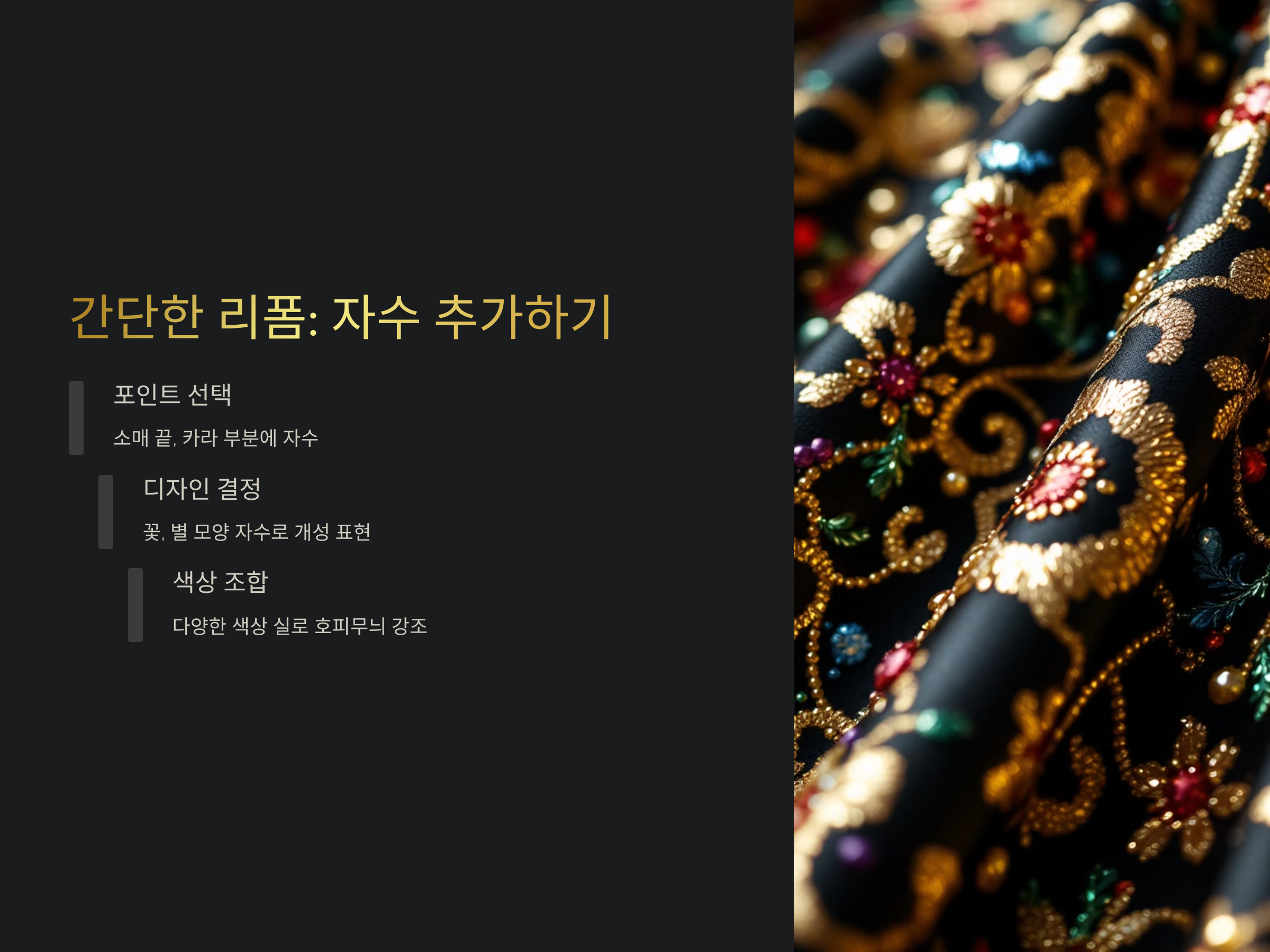 또한, 자수를 넣을 때는 의류의 특정 부분에만 포인트로 넣을 수도 있습니다. 예를 들어, 소매 끝이나 옷의 카라 부분에 자수를 넣으면 좀 더 세련된 느낌을 줄 수 있습니다. 자수는 손쉽게 할 수 있는 리폼 방법이므로, 초보자도 부담 없이 시도할 수 있습니다.