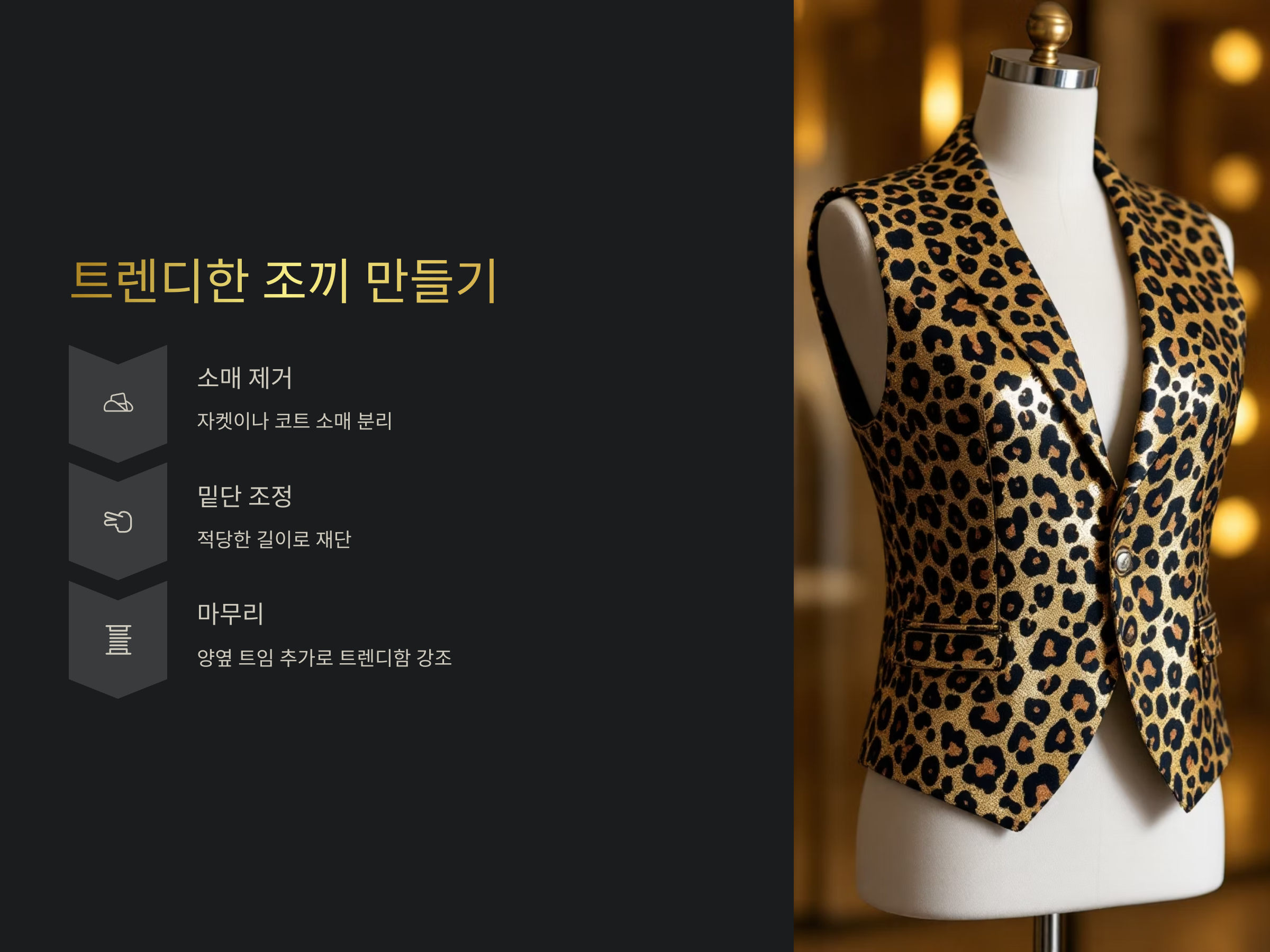 호피 자켓이나 코트를 리폼하여 조끼로 변형하는 방법도 있습니다. 호피 자켓이나 코트의 소매를 제거하고, 밑단을 약간 조정하면 멋진 조끼가 완성됩니다. 이 방법은 시즌에 맞춰 변화를 주기에 좋고, 특히 여름에는 시원하게 착용할 수 있어 유용합니다.