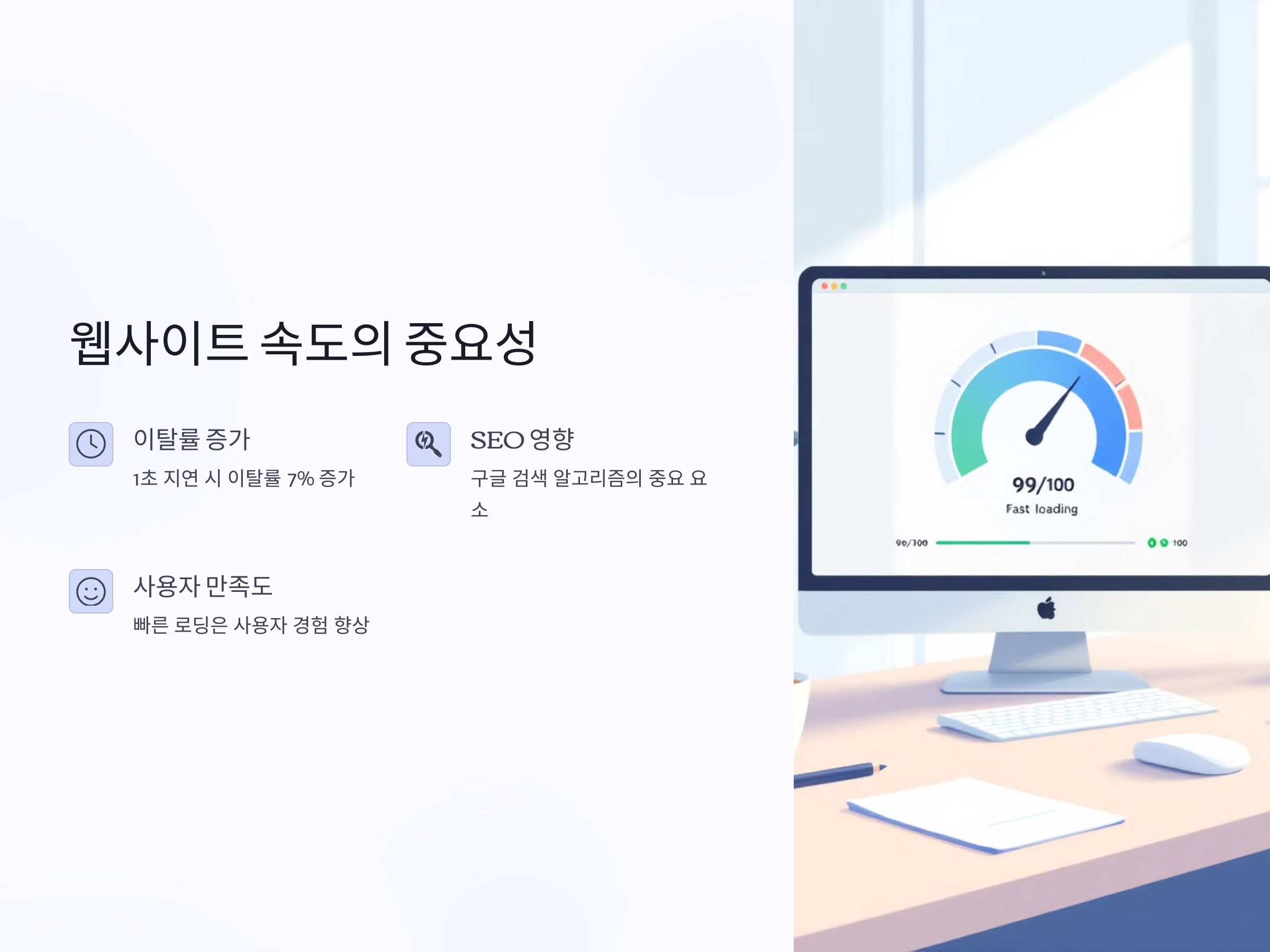 웹사이트 속도는 방문자의 경험에 직접적인 영향을 미칩니다. 페이지 로딩 시간이 1초만 지연되어도 이탈률이 7% 증가한다는 연구 결과가 있습니다. 또한, 페이지 속도는 구글의 검색 알고리즘에서 중요한 요소로, SEO에도 큰 영향을 미칩니다. 빠른 웹사이트는 사용자 만족도를 높이고, 검색 엔진에서 우선 순위로 처리됩니다.