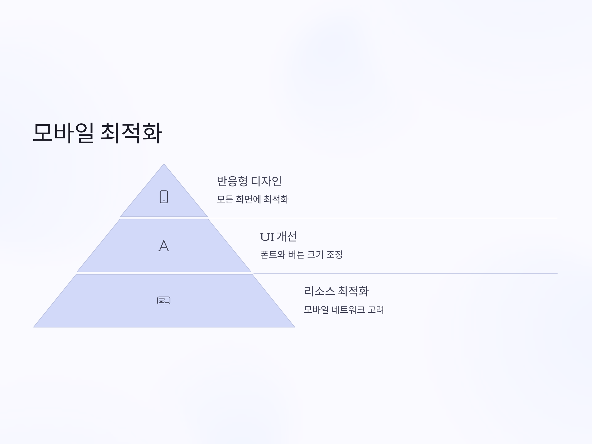 모바일 화면에서 텍스트가 잘 보이도록 폰트 크기 조정과 버튼 크기 최적화, 터치스크린을 고려한 UI 디자인 개선이 필요합니다. 또한, 모바일 네트워크 환경에서 빠르게 로딩될 수 있도록 리소스를 최적화하는 작업이 중요합니다.