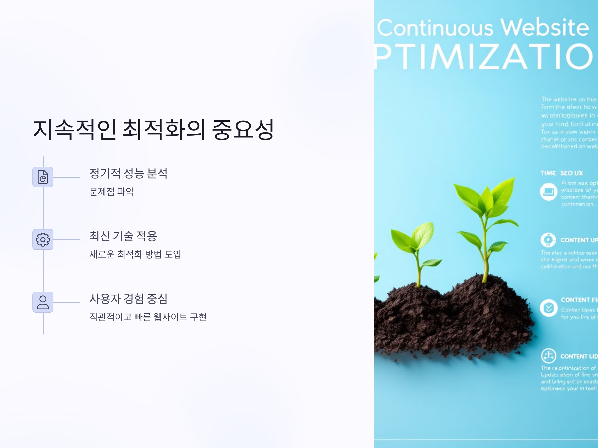 웹사이트 최적화는 한 번의 작업으로 끝나는 것이 아니라 지속적으로 점검하고 개선해야 할 과정입니다. 최신 기술과 도구를 활용하여 웹사이트 성능을 개선하고, 사용자 경험을 향상시키는 것이 중요합니다. 속도, 모바일 최적화, SEO를 모두 고려한 홈페이지 최적화는 웹사이트의 성공적인 운영을 돕습니다.