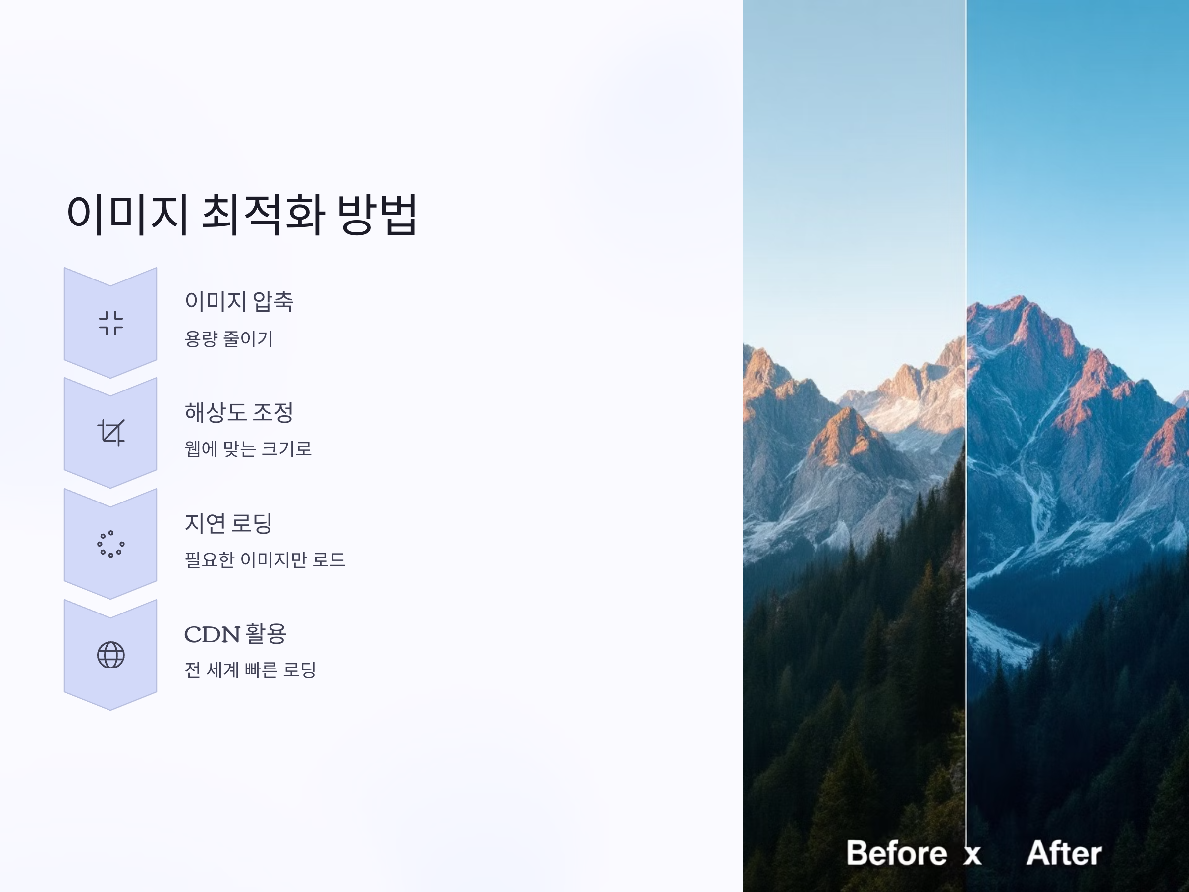 구체적인 최적화 방법으로는 이미지의 해상도를 웹에 맞게 조정하고, 필요한 이미지만 로딩하도록 Lazy Loading 기법을 적용하는 것입니다. 또한, CDN(Content Delivery Network)을 활용해 전 세계 어디서든 빠르게 이미지가 로드되도록 할 수 있습니다.