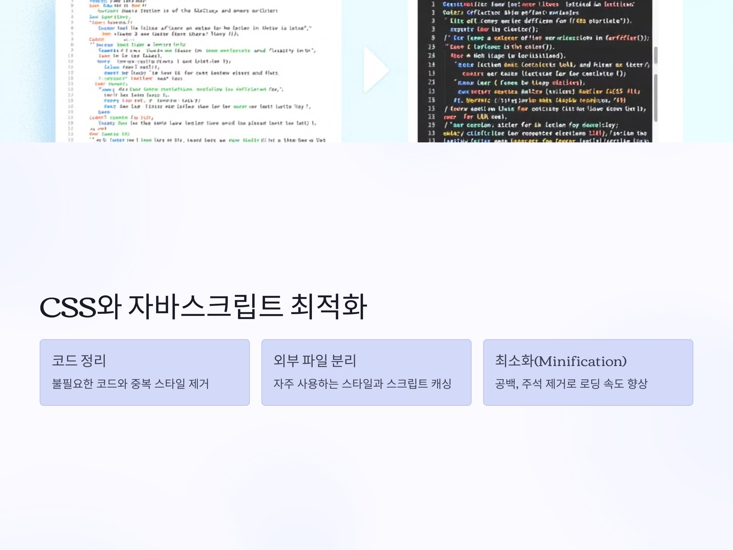 웹사이트 성능을 개선하려면 CSS와 자바스크립트 최적화도 필수적입니다. 불필요한 코드나 중복된 스타일을 제거하고, 자주 사용하는 스타일과 스크립트는 외부 파일로 분리하여 캐싱할 수 있습니다. 이를 통해 브라우저가 페이지를 로드할 때 더 빠르게 처리할 수 있습니다.