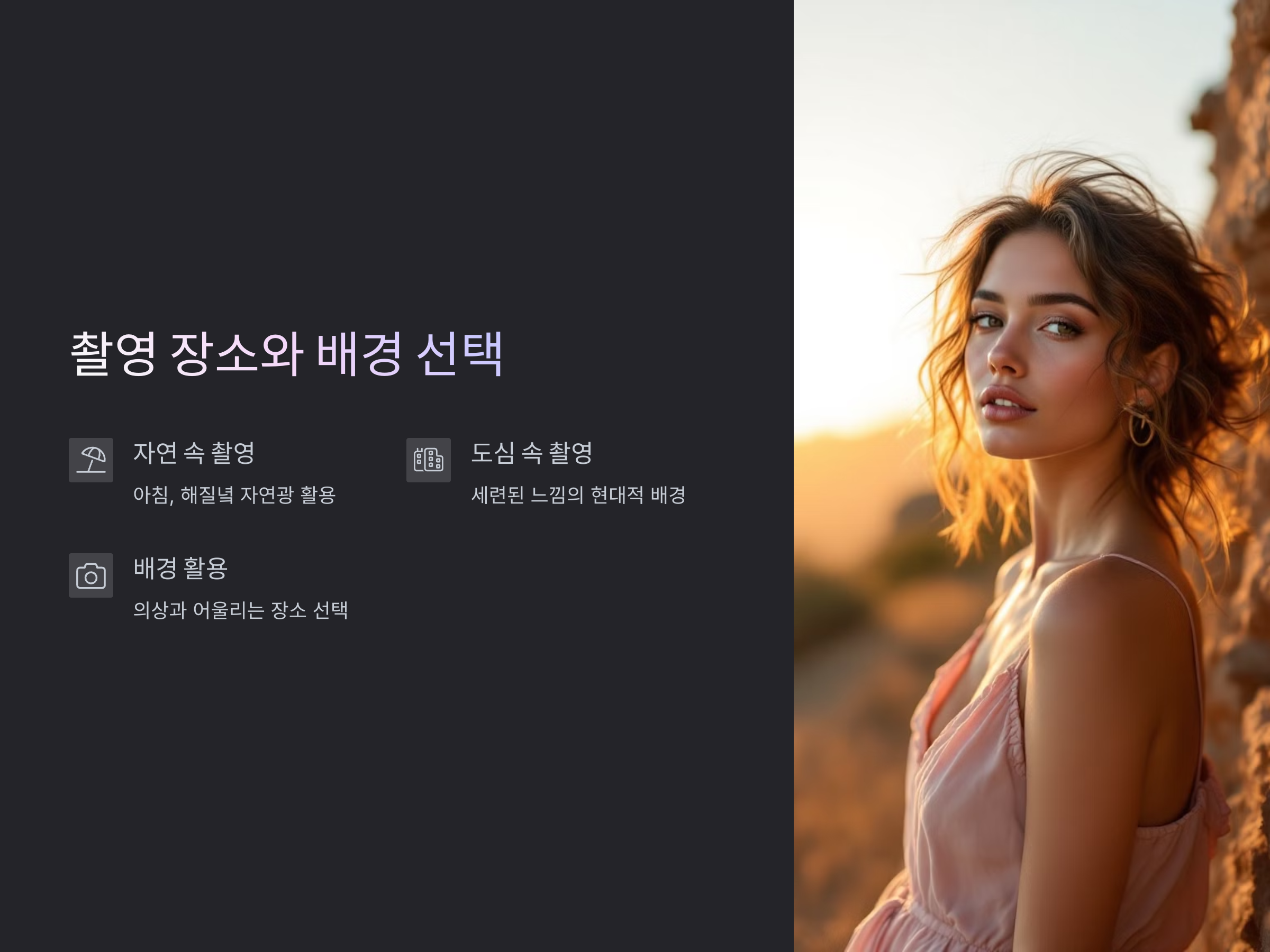 자연 속에서 촬영을 한다면, 자연광을 최대한 활용하는 것이 좋습니다. 아침 일찍이나 해질 무렵의 따뜻한 빛은 피부 톤을 아름답게 살려주고, 배경과 어울려 더 자연스러운 사진을 만들 수 있습니다. 바다, 숲, 산과 같은 배경에서는 자연스럽고 편안한 스타일을 강조하는 옷을 선택하는 것이 중요합니다.