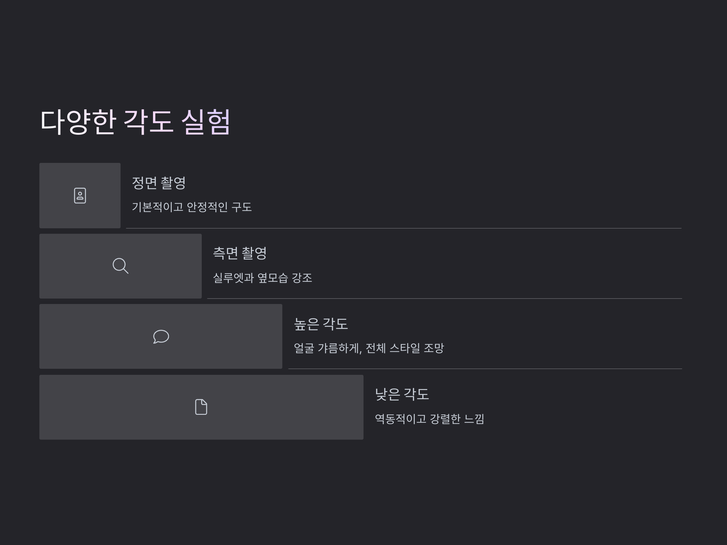 사진을 찍을 때, 카메라의 각도와 높이를 조정하는 것도 중요한 요소입니다. 위에서 내려다보는 각도는 얼굴을 갸름하게 보이게 할 수 있으며, 아래에서 찍으면 더욱 역동적이고 강렬한 느낌을 줄 수 있습니다. 여러 각도를 시도하여 가장 잘 어울리는 느낌을 찾는 것이 중요합니다.