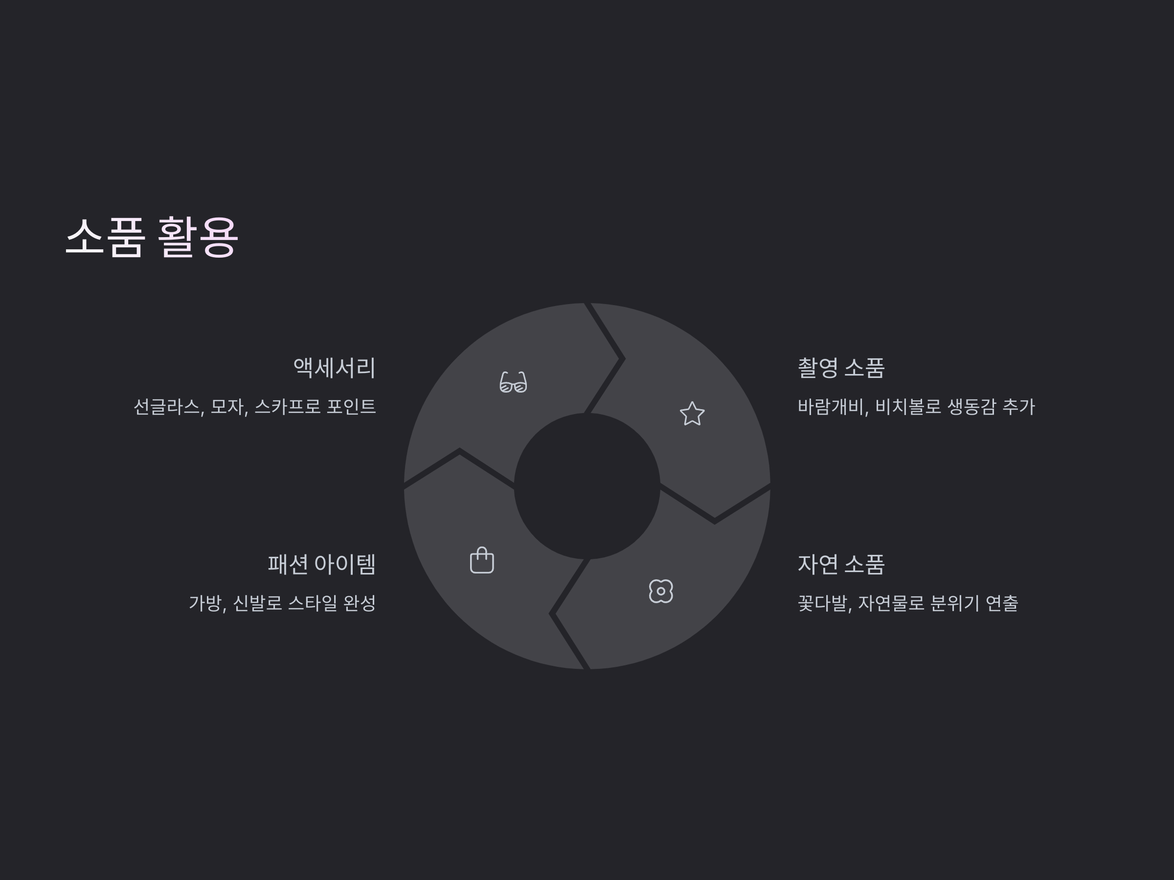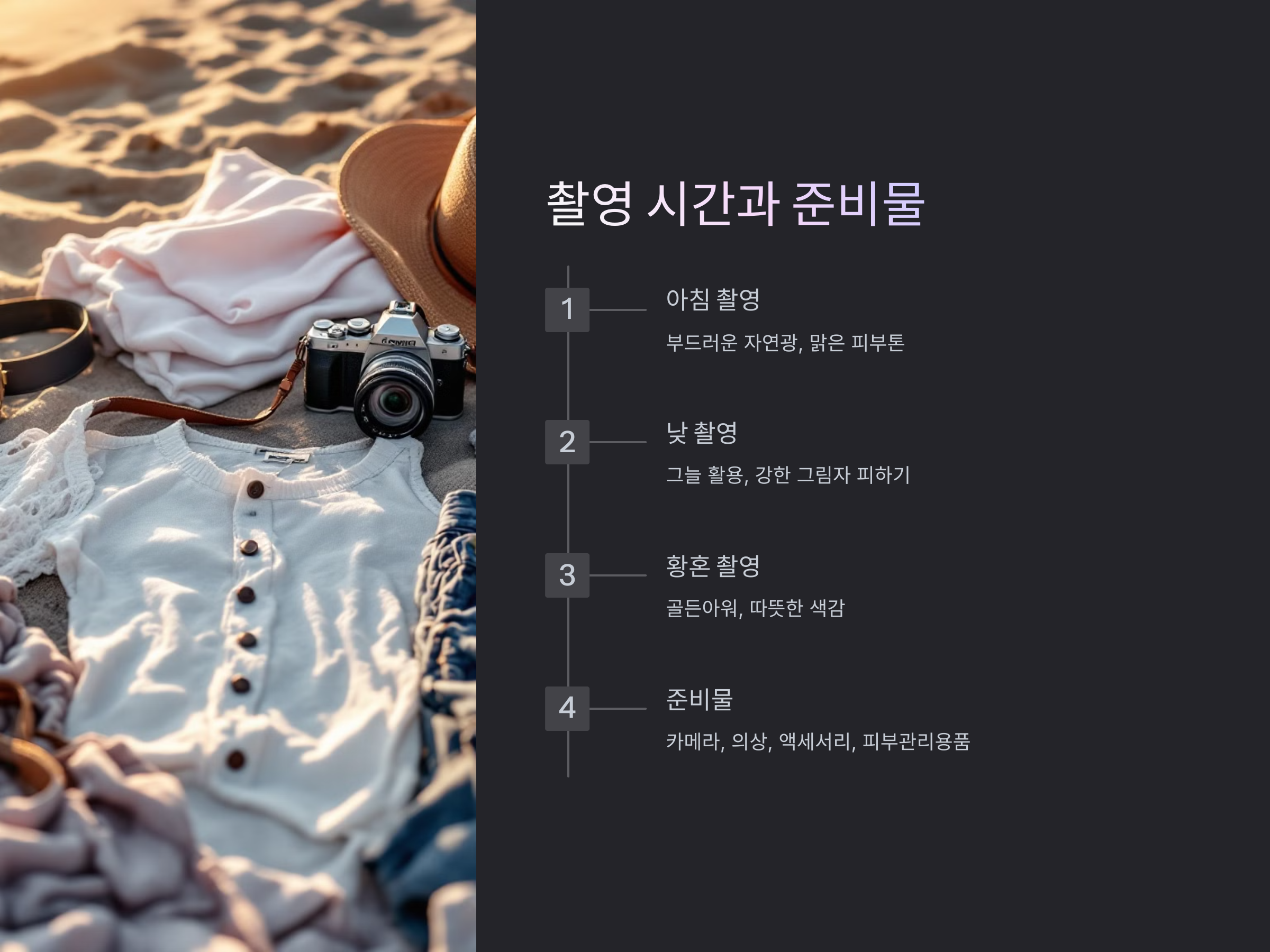 휴가를 떠나기 전에, 자신의 스타일을 어떻게 표현할지 고민하는 것은 매우 중요한 과정입니다. 하지만 스타일뿐만 아니라 촬영 장소, 촬영 각도, 그리고 촬영 소품까지 고려하면 훨씬 더 완성도 높은 화보를 만들 수 있습니다. 지금부터 그 비법을 하나씩 풀어보겠습니다!