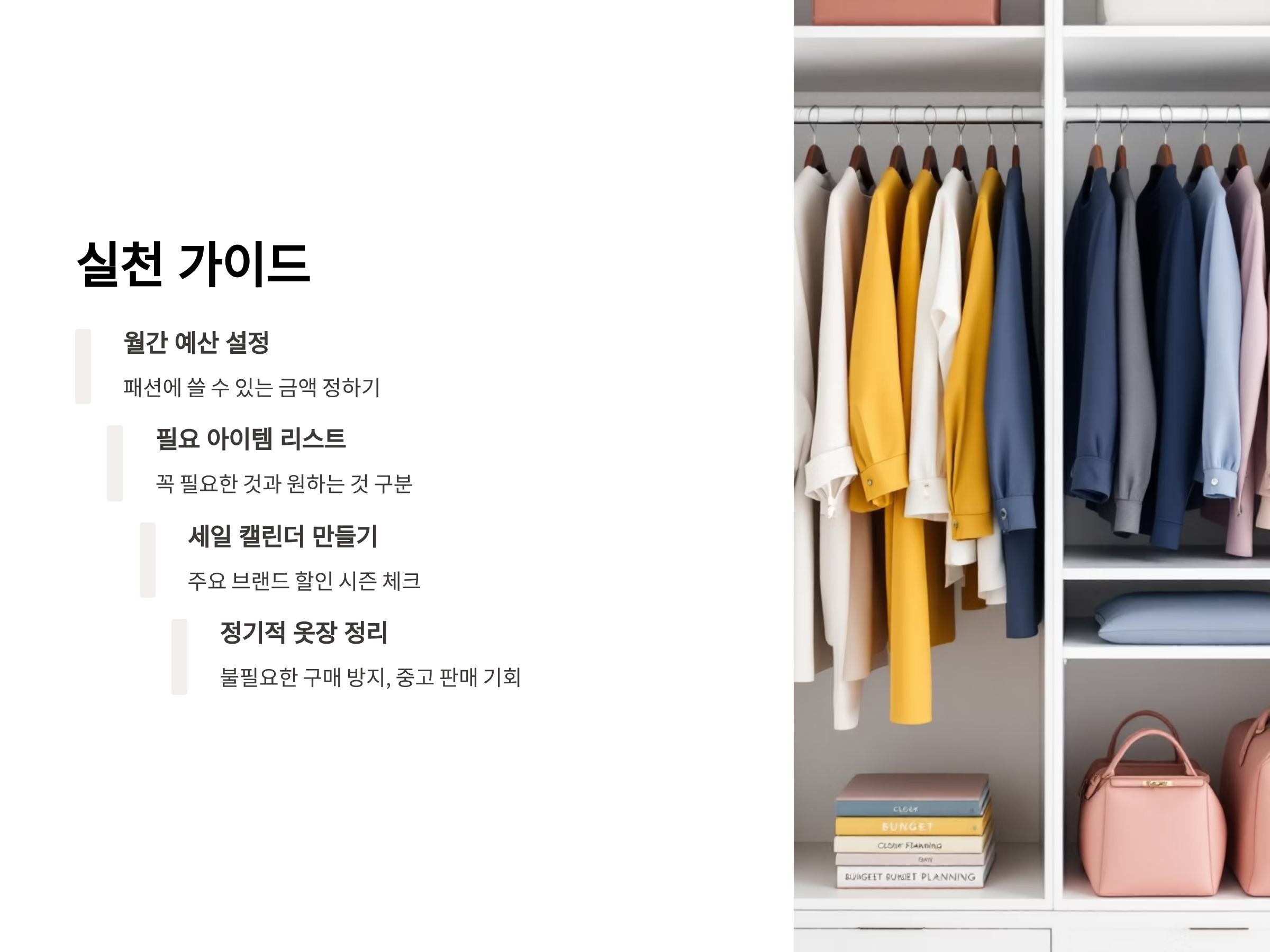 패션 예산을 짤 때는 고정비와 유동비를 정확히 구분해야 합니다. 고정비에는 매달 필요한 의류나 액세서리, 신발 등의 예산을 포함시키고, 유동비에는 세일이나 할인 이벤트 등을 활용한 구매 계획을 세워 보세요. 예를 들어, 세일 기간에 필요한 아이템을 미리 리스트업해 두고, 할인된 가격에 구입하면 예산을 절약할 수 있습니다. 또한, 유동비 항목으로는 한정판 아이템이나 특별한 이벤트를 위한 예산을 포함시킬 수 있습니다.