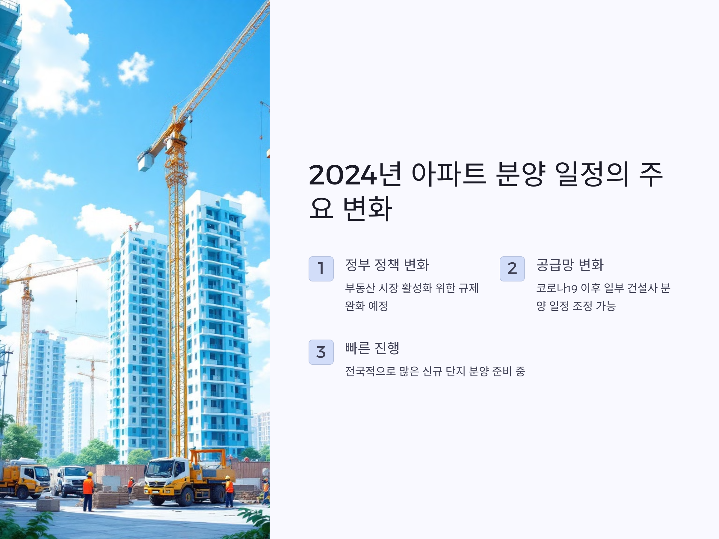 2024년 아파트 분양 일정에서는 기존의 분양 일정과 비교해 몇 가지 중요한 변화가 있을 것으로 보입니다. 먼저, 정부의 부동산 정책과 관련된 변화가 분양 일정을 좌우할 수 있습니다. 예를 들어, 부동산 시장의 활성화를 위해 다양한 규제 완화가 이루어질 예정이며, 이는 분양 일정과 가격에 영향을 미칠 수 있습니다. 또한, 코로나19 이후 공급망의 변화로 인해 일부 건설사의 분양 일정이 조정되거나 미뤄질 수 있습니다.