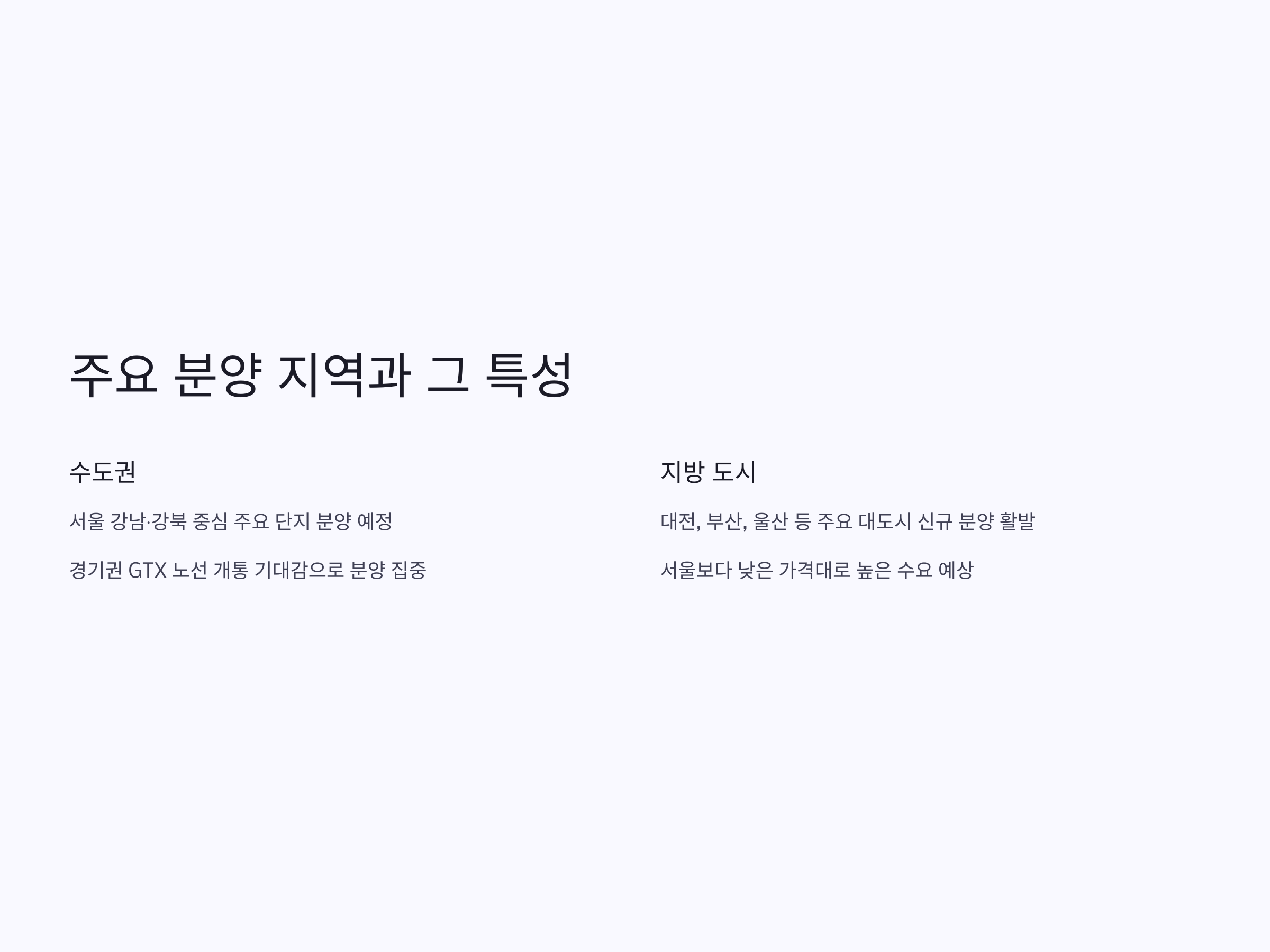 수도권에서는 교통 호재와 생활 편의 시설이 잘 갖춰진 지역들이 주목받고 있습니다. 서울의 경우, 강남, 강북을 중심으로 한 주요 단지들이 분양 예정이며, 특히 강남권의 분양은 늘 높은 경쟁률을 자랑합니다. 또한, 경기권에서는 GTX 노선 개통에 따른 기대감으로 분양 일정이 집중될 것으로 예상됩니다.