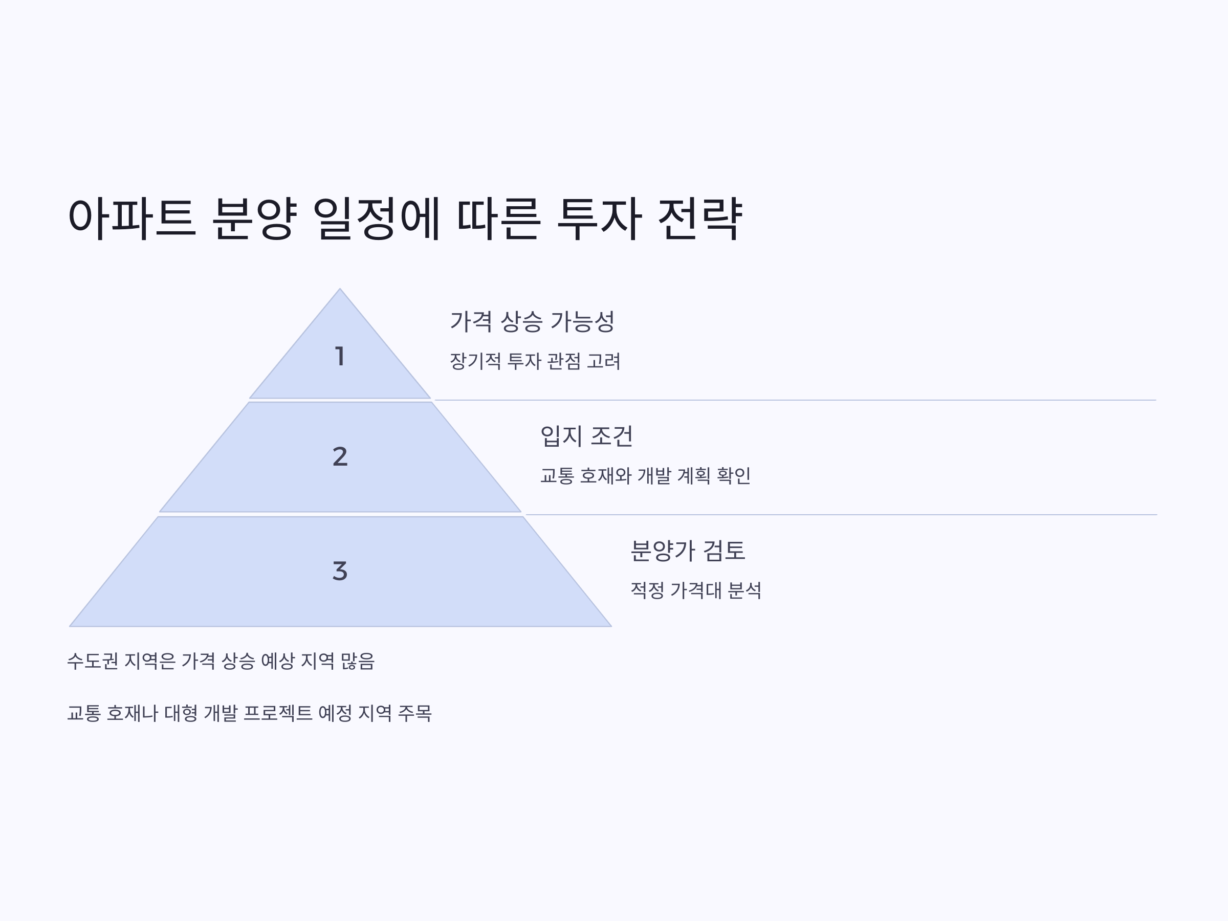 투자 시 고려해야 할 요소는 분양가, 입지, 향후 가격 상승 가능성 등입니다. 2024년 분양 일정 중에서는 교통 호재가 있는 지역이나 대형 개발 프로젝트가 예정된 지역들이 많습니다. 이러한 지역은 향후 시세 상승이 기대되는 곳이므로, 장기적인 투자 관점에서 매우 매력적일 수 있습니다. 이를 위해 분양 일정이 발표되기 전, 관련 지역의 개발 계획이나 교통망 등을 미리 조사하는 것이 유리합니다.
