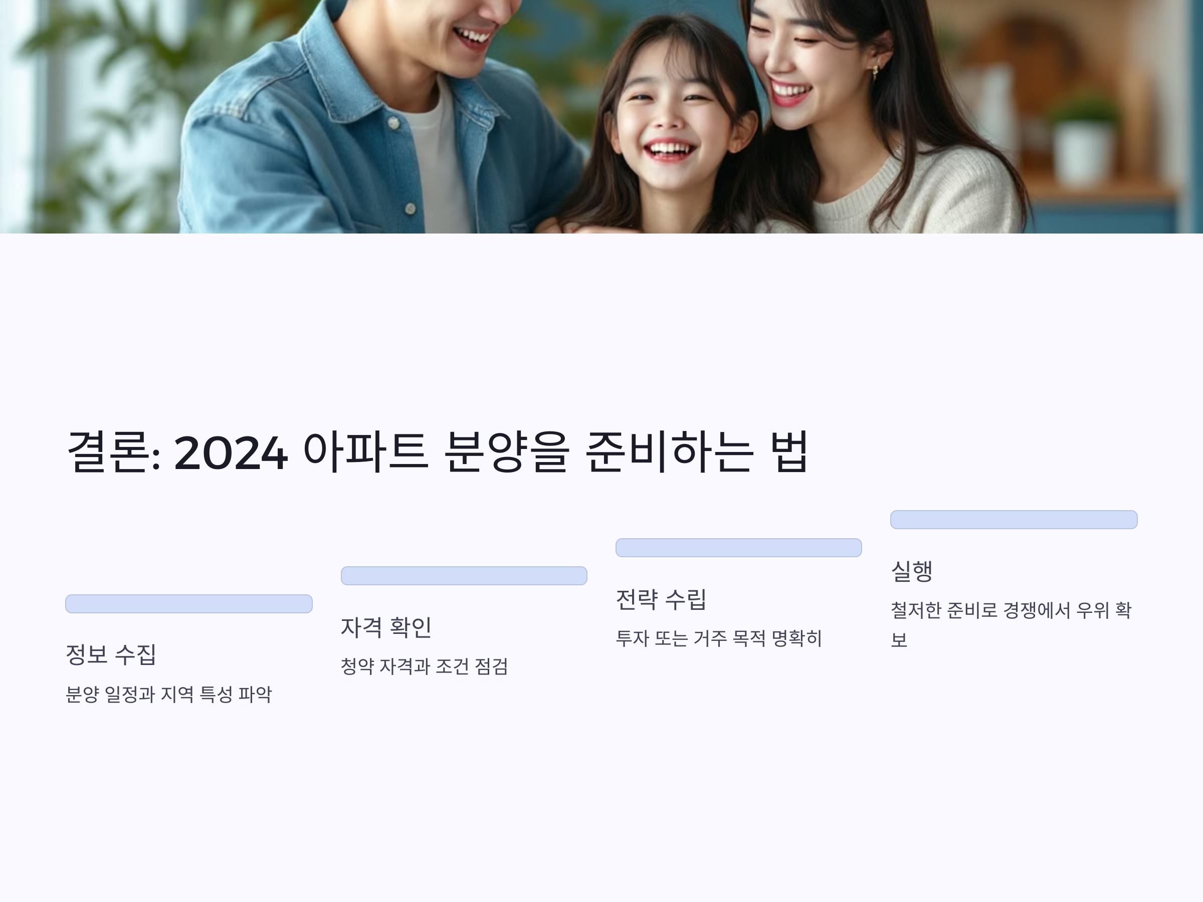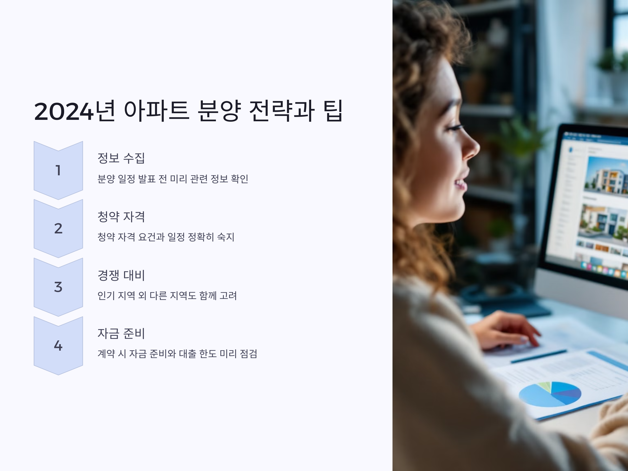 2024년 아파트 분양에 있어 중요한 전략은 정확한 정보 수집과 시장 흐름을 잘 파악하는 것입니다. 분양 일정이 발표되기 전에 미리 관련 정보를 확인하고, 분양이 진행될 예정인 단지들의 특성을 파악하는 것이 우선입니다. 또한, 청약 자격 요건과 청약 일정 등을 정확하게 숙지하여, 청약에 유리한 위치를 차지하는 것이 필요합니다.