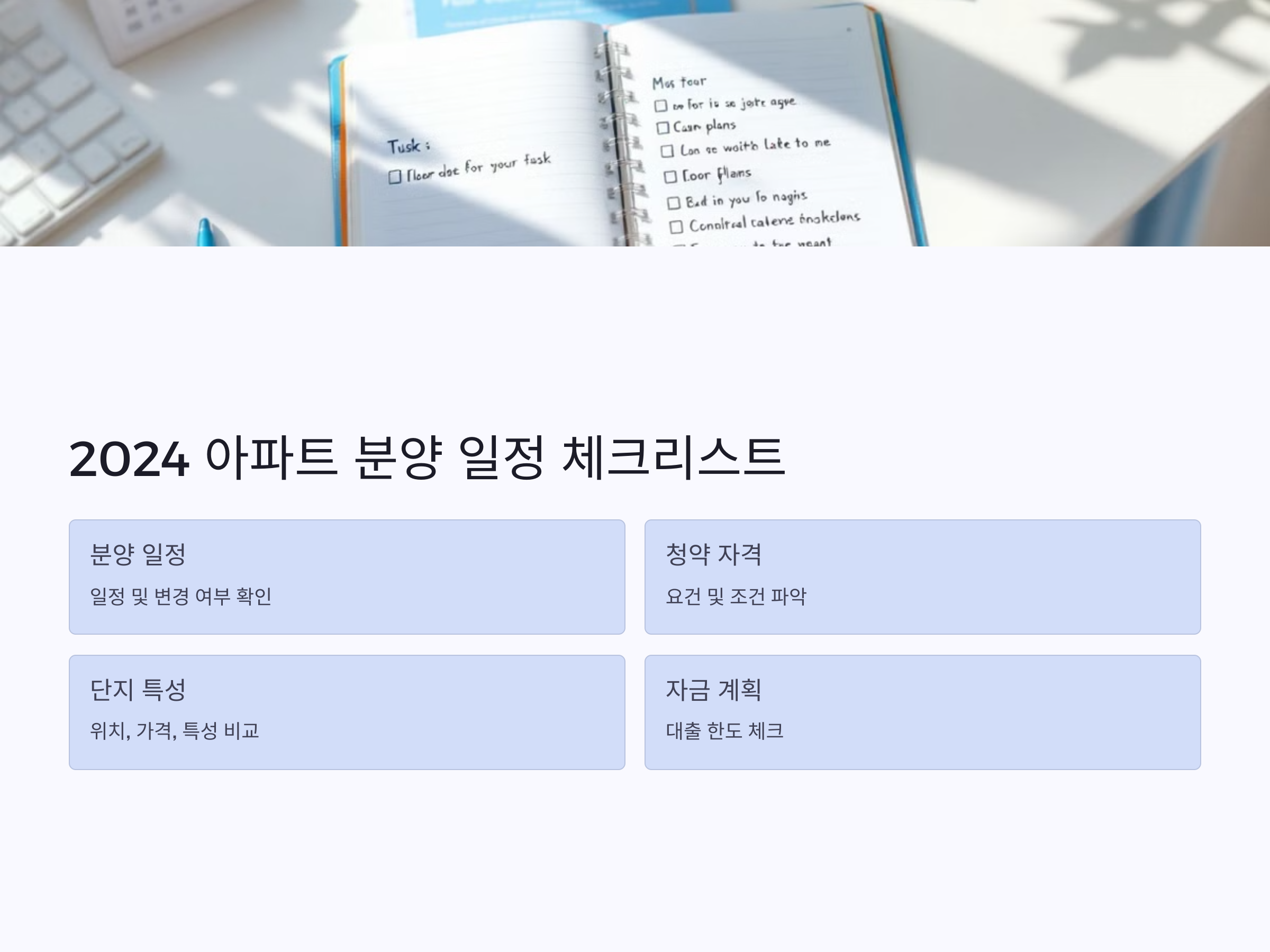 2024년 아파트 분양을 준비하면서 유용한 체크리스트를 작성해보는 것도 좋은 방법입니다. 체크리스트를 통해 분양 일정뿐만 아니라, 청약 자격 요건, 청약 일정, 각 단지의 특성 등을 한눈에 파악할 수 있어 실수를 줄이고 준비를 철저히 할 수 있습니다.