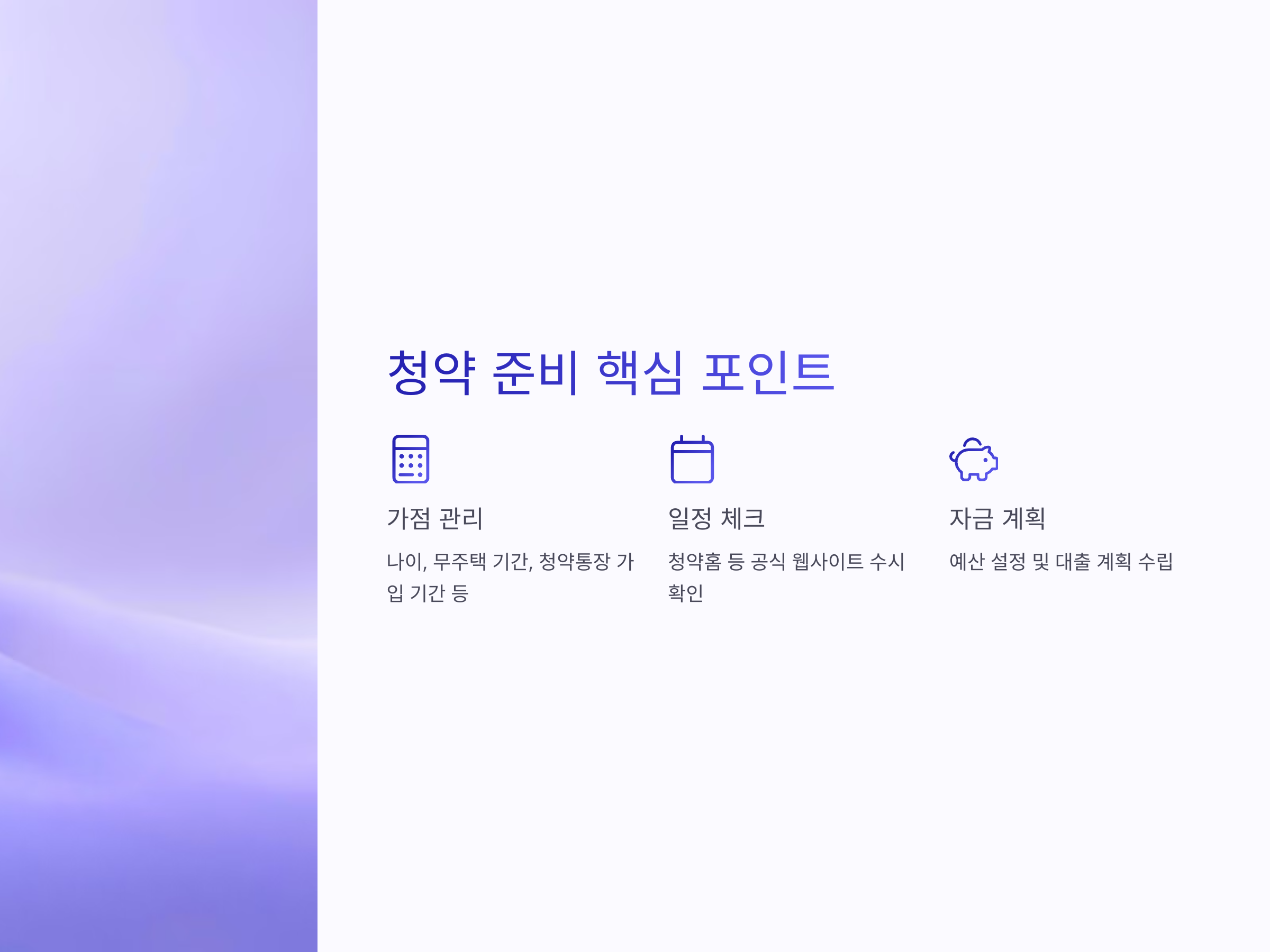 청약을 준비하는 가장 중요한 요소는 '가점 관리'입니다. 가점은 나이, 무주택 기간, 청약 통장 가입 기간 등 다양한 요소로 산정됩니다. 이 외에도 청약 조건을 꼼꼼히 확인하고, 예산을 잘 계획하는 것이 중요합니다.