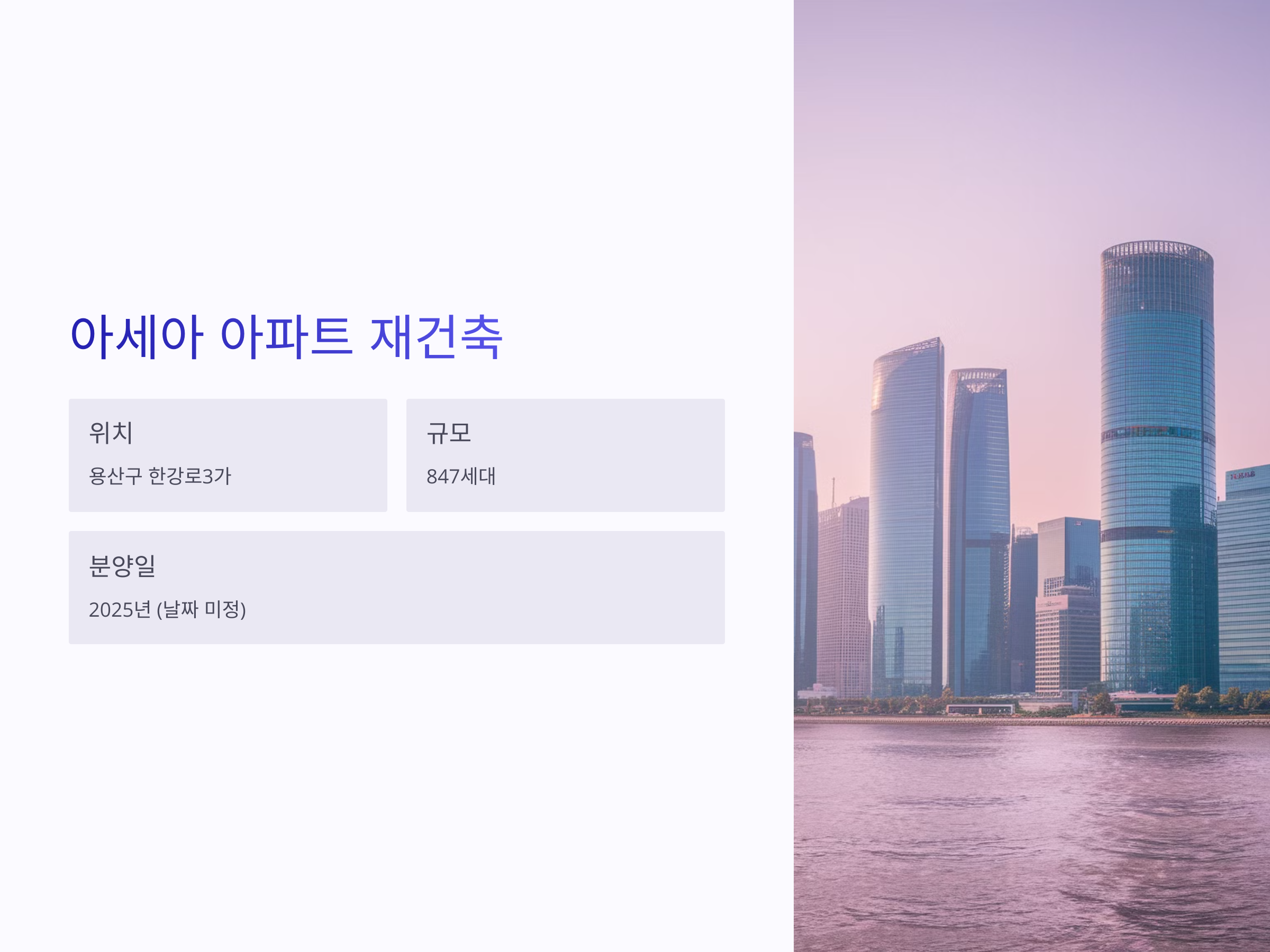 용산구는 최근 재개발과 재건축으로 빠르게 발전하고 있는 지역입니다. 특히 아세아 아파트는 용산공원과 국제업무지구 인근에 위치해 있어 미래의 수요가 기대되는 지역입니다. 교통도 편리하고, 생활 인프라가 잘 구축되어 있어 안정적인 거주지를 찾는 이들에게 매력적인 아파트가 될 것입니다.