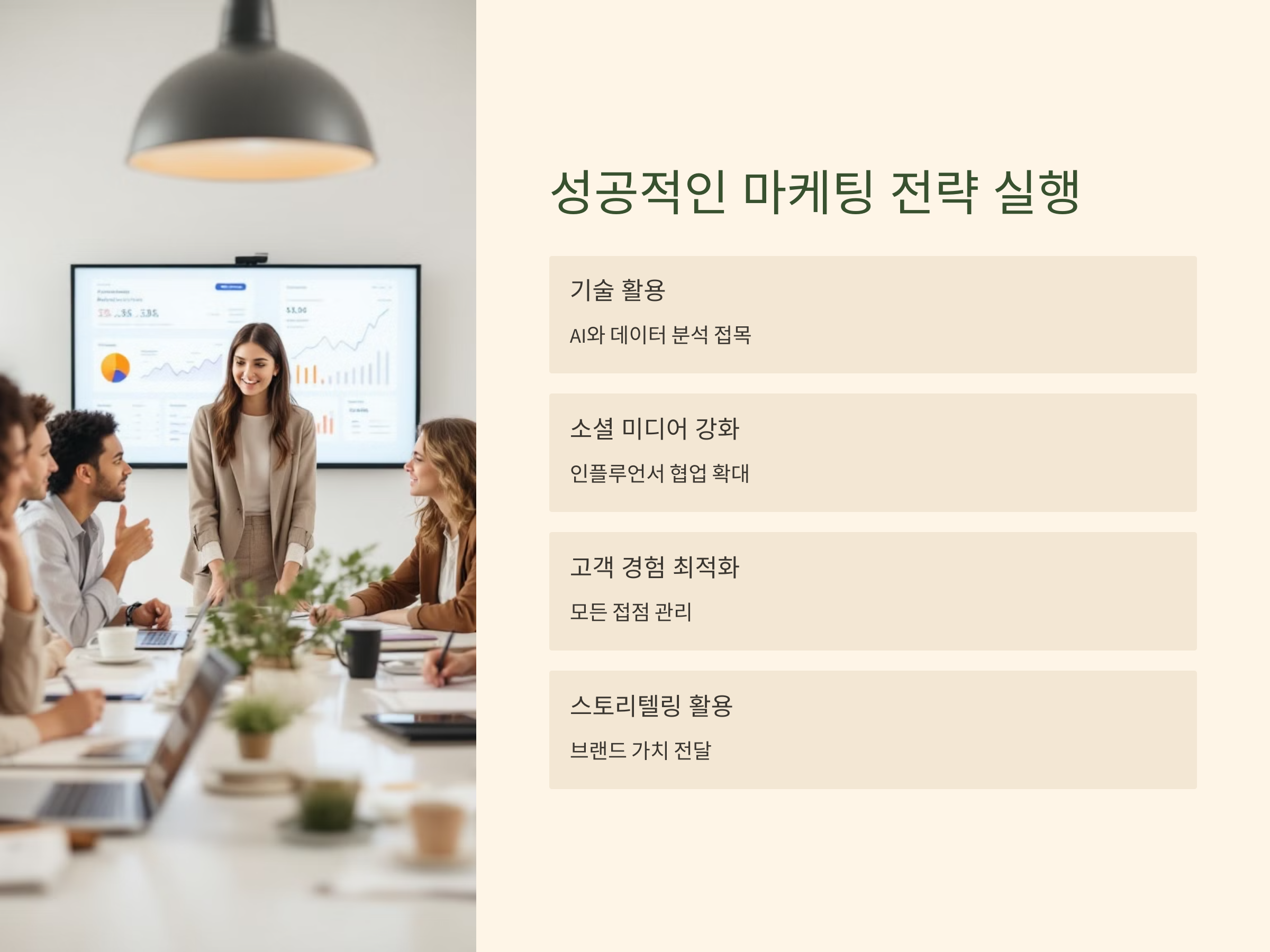 2025년의 마케팅 전략은 기술의 발전과 소비자 행동의 변화를 잘 반영해야 성공적일 수 있습니다. AI와 데이터 분석을 통한 개인화, 소셜 미디어와 인플루언서 마케팅의 강화, 고객 경험 최적화, 그리고 스토리텔링을 활용한 콘텐츠 마케팅이 핵심 요소로 떠오르고 있습니다. 이러한 요소들을 결합하여 전략적으로 접근하는 것이 중요합니다. 지속적으로 변화하는 마케팅 환경에서, 창의적이고 유연한 전략을 통해 성과를 극대화할 수 있습니다.