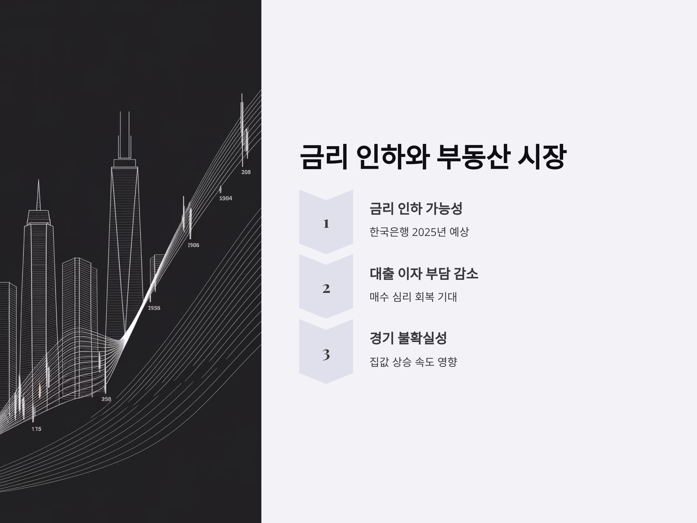 2025년에는 한국은행의 금리 인하 가능성이 높게 점쳐지고 있습니다. 이는 부동산 시장에 직접적인 영향을 미치는 요소로 작용할 것입니다. 금리가 하락하면 주택담보대출 이자 부담이 줄어들어 매수 심리가 회복될 수 있습니다. 그러나 경기 불확실성이 지속된다면 집값 상승 속도는 더딜 수 있으므로, 금리 변동에 따른 시장 반응을 주의 깊게 살펴봐야 합니다.