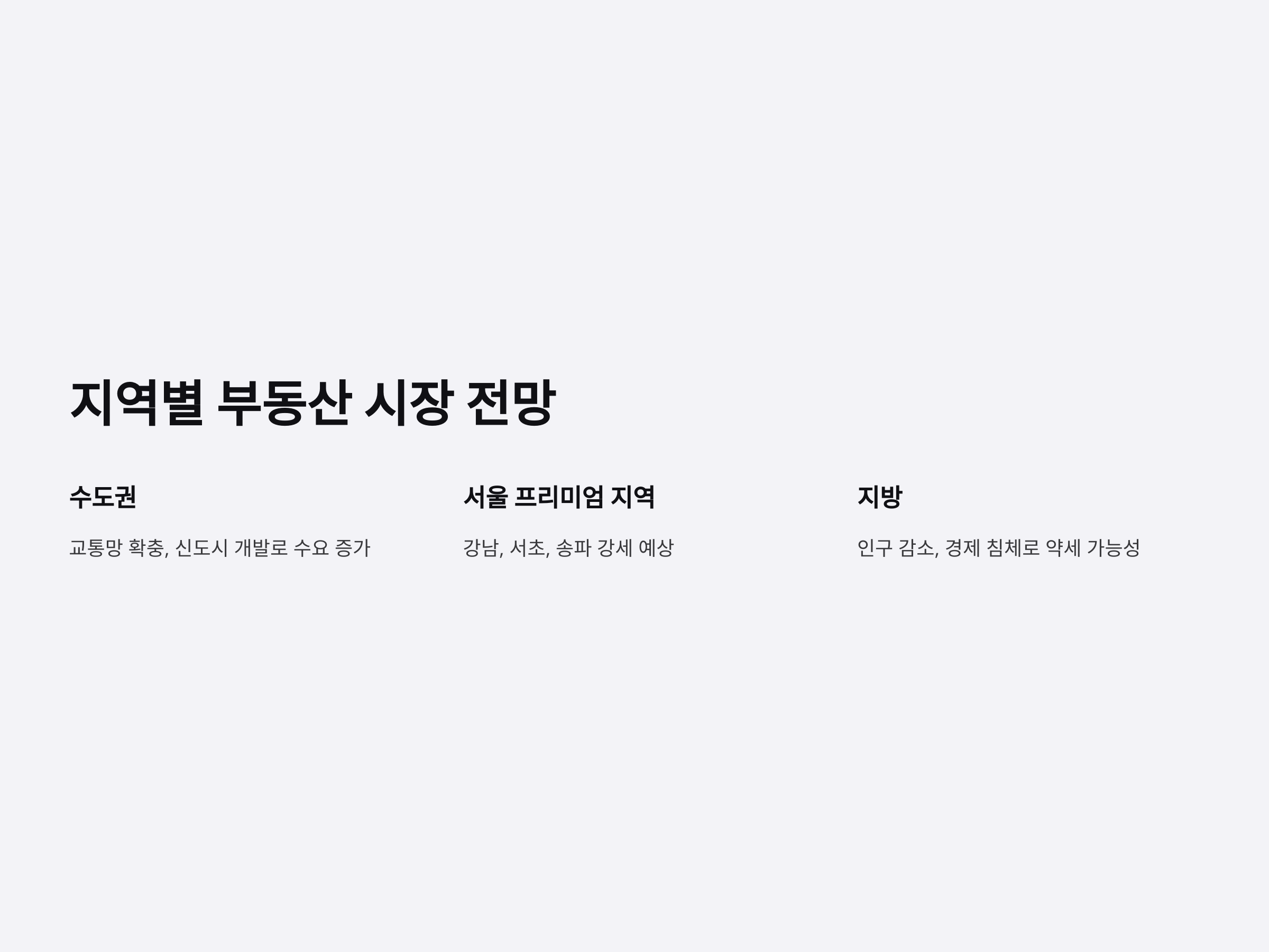 수도권과 지방의 부동산 시장은 상반된 흐름을 보일 것으로 예상됩니다. 수도권은 교통망 확충과 신도시 개발로 수요 증가가 예상되며, 특히 서울의 강남, 서초, 송파 등 프리미엄 지역은 강세를 보일 것으로 전망됩니다. 반면, 지방은 인구 감소와 경제 침체로 인해 부동산 가격이 약세를 보일 가능성이 높습니다. 이러한 지역별 특성을 고려한 투자 전략이 필요합니다.