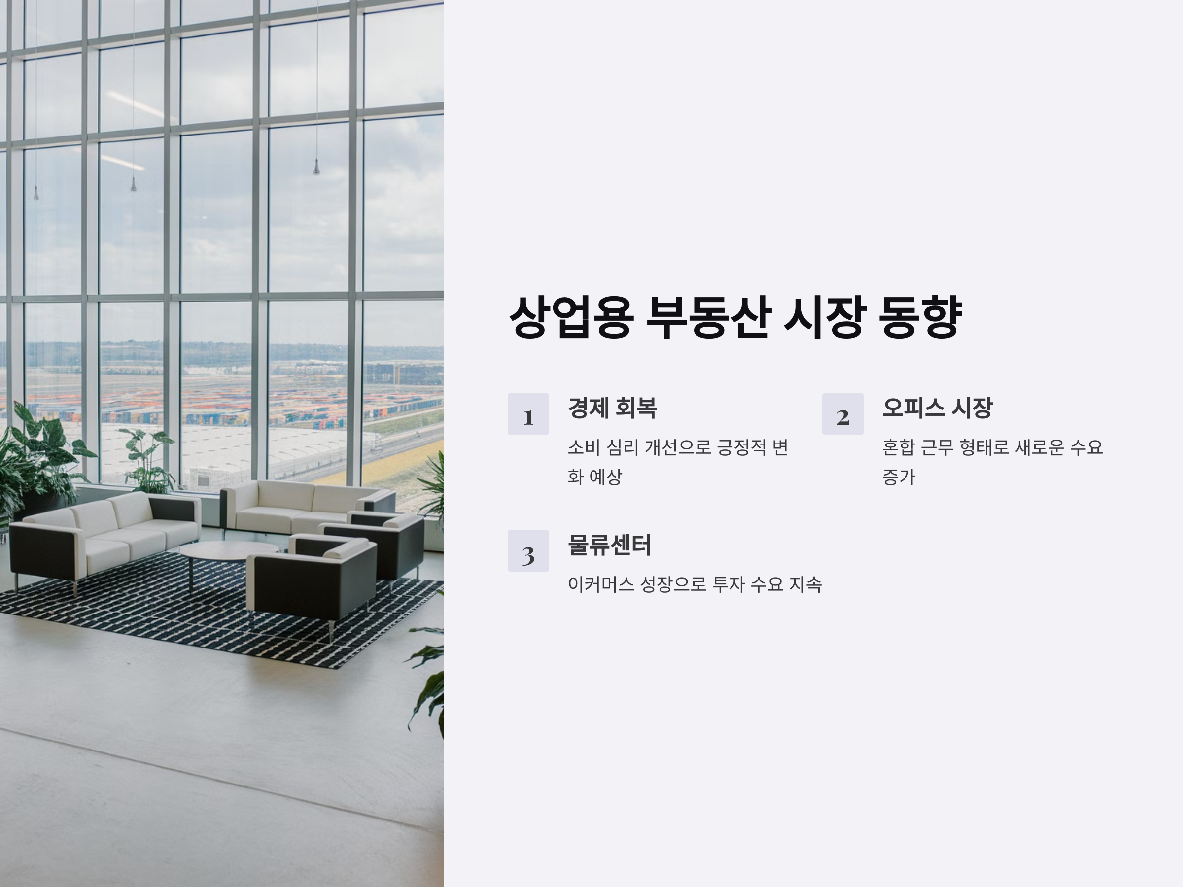 상업용 부동산 시장은 경제 회복과 소비 심리 개선에 따라 긍정적인 변화를 보일 것으로 예상됩니다. 특히, 오피스 시장은 재택근무와 오피스 근무의 혼합 형태가 자리 잡으면서 새로운 형태의 오피스 공간에 대한 수요가 증가할 것입니다. 또한, 이커머스의 성장으로 물류센터에 대한 투자 수요도 지속될 전망입니다.