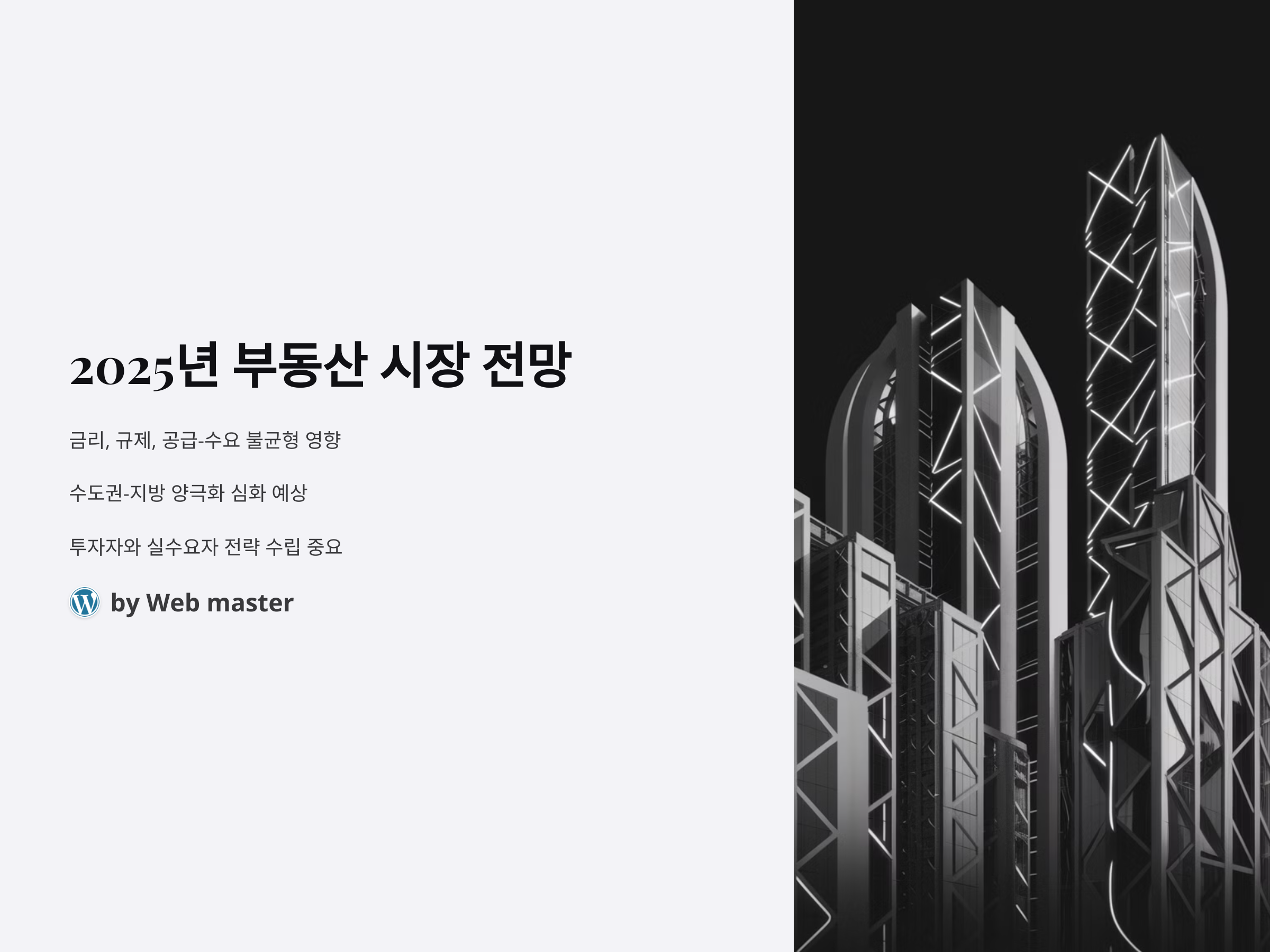2025년 부동산 시장은 다양한 요인들이 복합적으로 작용하여 큰 변화를 예고하고 있습니다. 금리 정책, 정부의 부동산 관련 규제, 지역별 공급과 수요의 불균형 등이 시장에 어떤 영향을 미칠지에 대한 분석이 필요합니다. 특히, 수도권과 지방 간의 양극화 현상이 심화될 것으로 예상되며, 투자자와 실수요자 모두 이러한 변화에 대비한 전략 수립이 중요합니다.