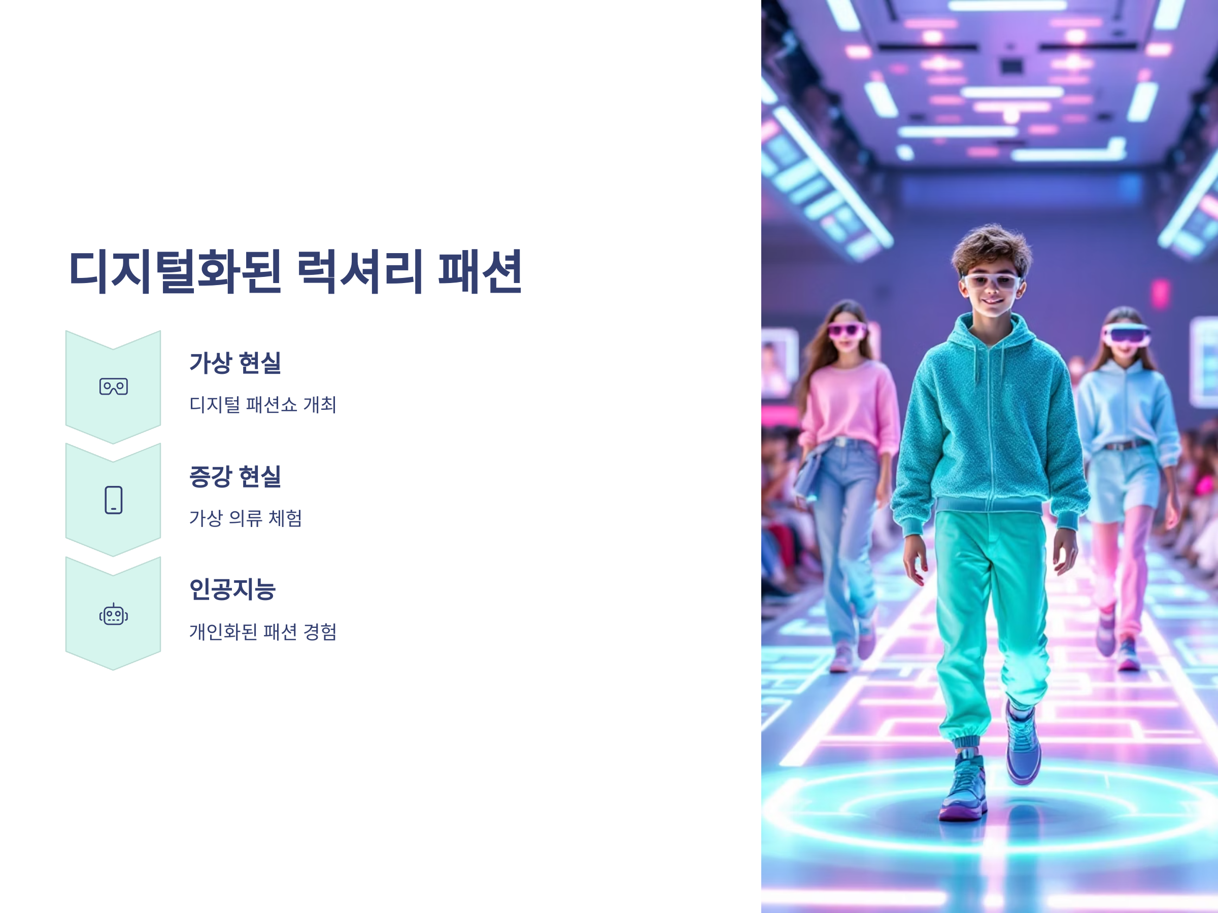 디지털 기술은 패션 산업에도 깊숙이 자리잡고 있습니다. 특히 가상 현실(VR), 증강 현실(AR), 그리고 인공지능(AI) 등이 결합된 디지털 럭셔리 패션은 2025년에 더욱 강화될 것입니다. 브랜드들은 온라인 플랫폼을 통해 가상 패션 쇼를 개최하거나, 디지털 의류를 선보이며 새로운 소비 경험을 제공하고 있습니다.