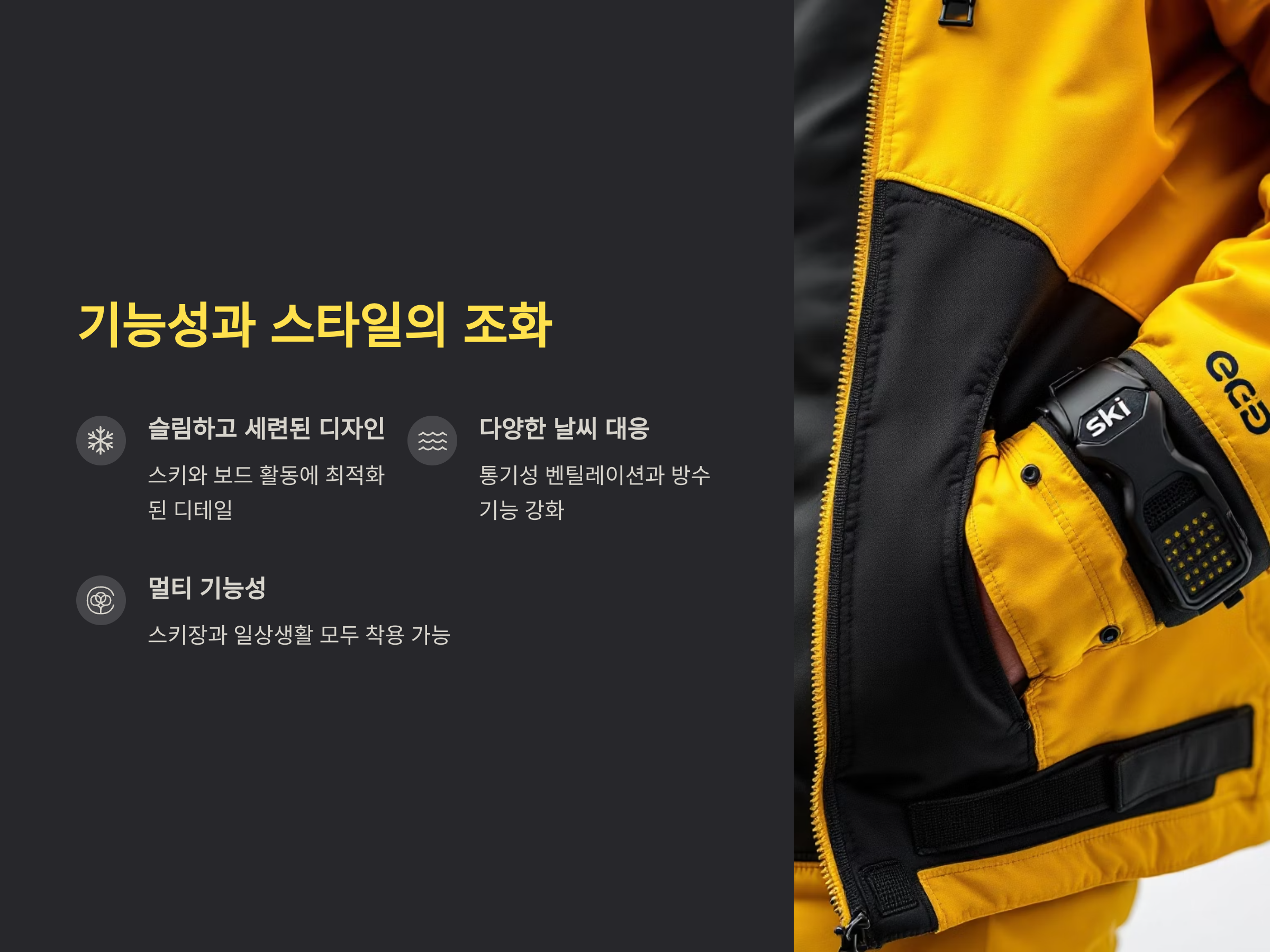 2025년 스키장 패션에서 가장 큰 특징은 바로 실용성과 스타일의 조화입니다. 스키복은 이제 더 이상 단순히 따뜻하게 해주는 역할만 하는 것이 아닙니다. 올해의 트렌드에서는 슬림하고 세련된 디자인을 가진 스키복이 눈에 띕니다. 기능성 소재를 사용하면서도, 스키와 보드 활동에 최적화된 디테일이 추가되었습니다. 또한, 색상 면에서도 다양화가 이루어졌고, 네온 컬러나 패턴이 과감하게 적용된 제품들이 많이 출시되고 있습니다.