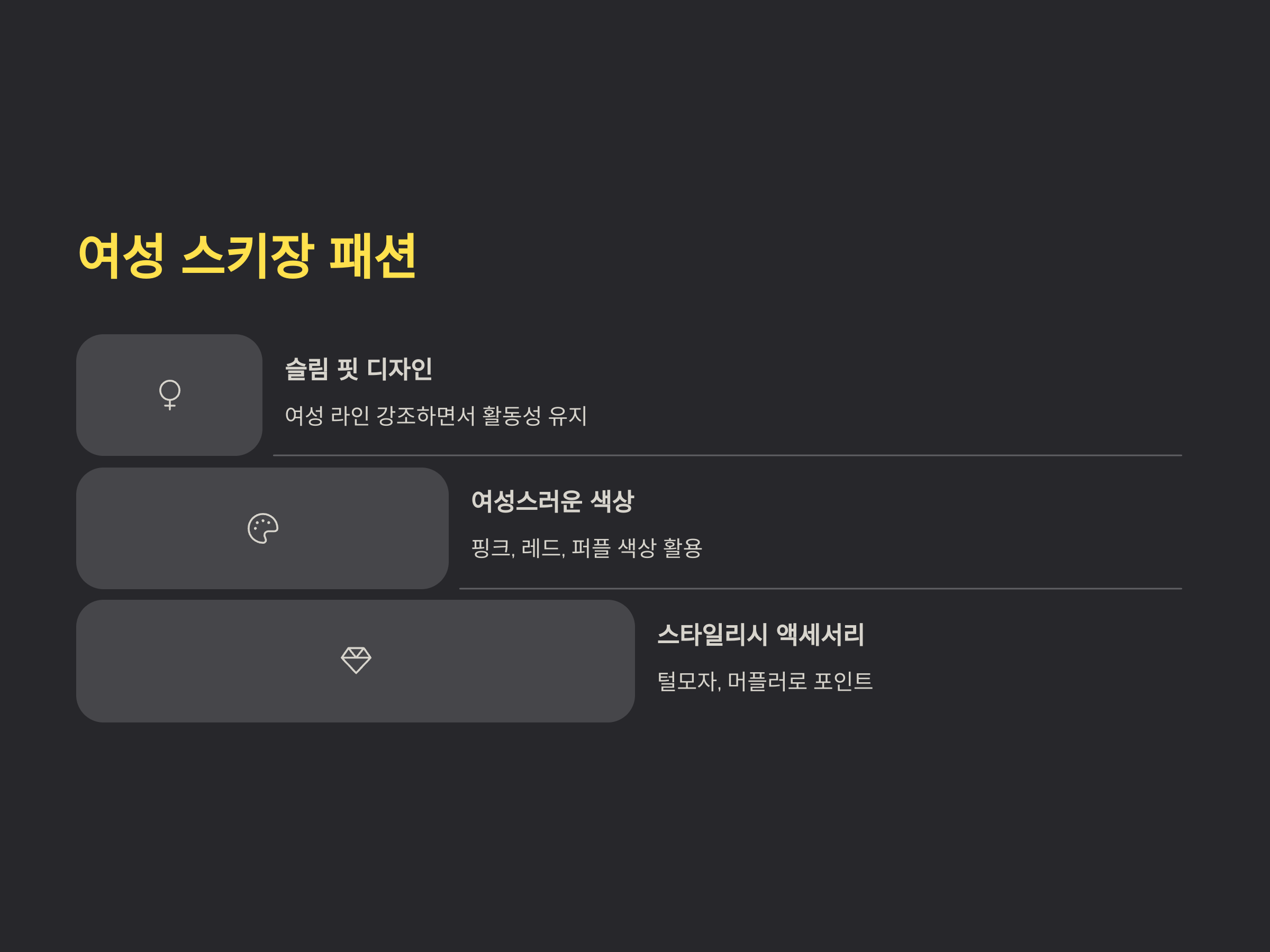 여성용 스키복에서는 특히 핑크색, 레드, 퍼플 같은 따뜻하고 여성스러운 색상이 주로 사용되며, 스키복 외에도 스타일리시한 털모자나 머플러 등 액세서리를 추가하여 멋을 한층 더할 수 있습니다. 이런 여성스러운 스키장 패션은 스타일을 중시하는 여성들에게 큰 인기를 끌 것입니다.