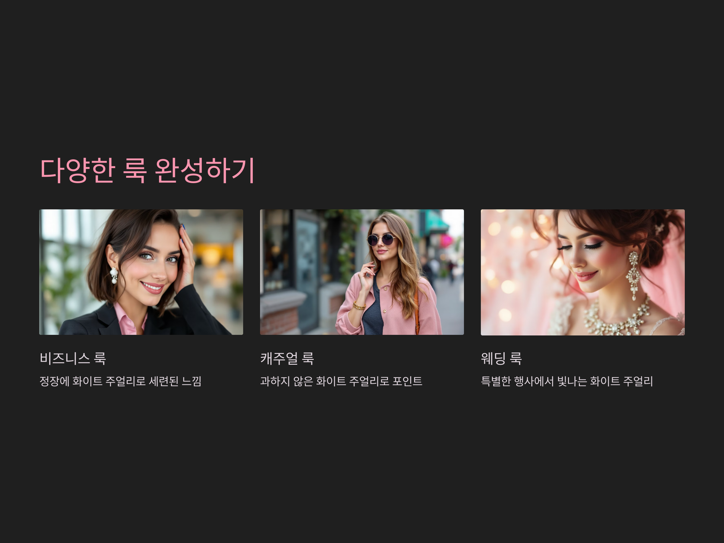 화이트 주얼리는 다양한 룩을 완성할 수 있는 멀티 기능을 가지고 있습니다. 예를 들어, 정장 룩이나 포멀한 드레스에 화이트 주얼리를 매치하면 세련된 비즈니스 룩을 연출할 수 있으며, 캐주얼한 룩에는 과하지 않은 화이트 패션 주얼리로 포인트를 줄 수 있습니다. 또한, 웨딩이나 특별한 행사에서 화이트 주얼리는 빛나는 역할을 하며, 신부나 참석자들에게 특별한 매력을 더합니다.