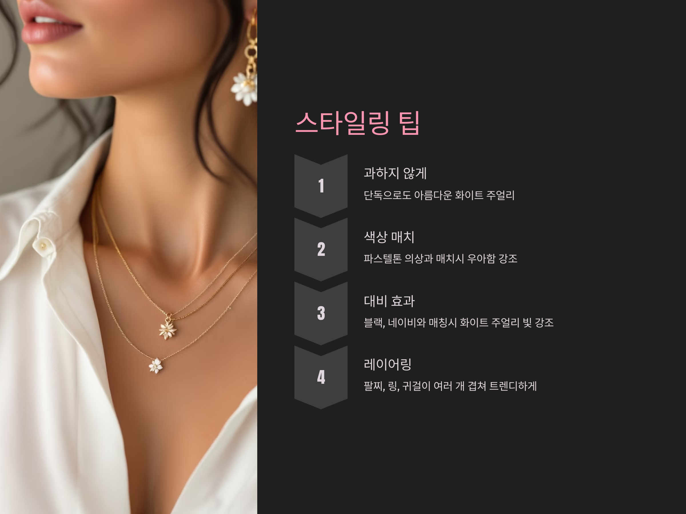 화이트 주얼리는 그 자체로 강한 존재감을 발휘하지만, 스타일링에 따라 더욱 돋보일 수 있습니다. 화이트 패션 주얼리를 활용한 스타일링에서 가장 중요한 점은 ‘과하지 않게’ 연출하는 것입니다. 화이트 톤의 주얼리는 단독으로도 아름답지만, 다른 색상이나 디자인의 옷과 함께 매칭할 때 그 효과가 극대화됩니다.