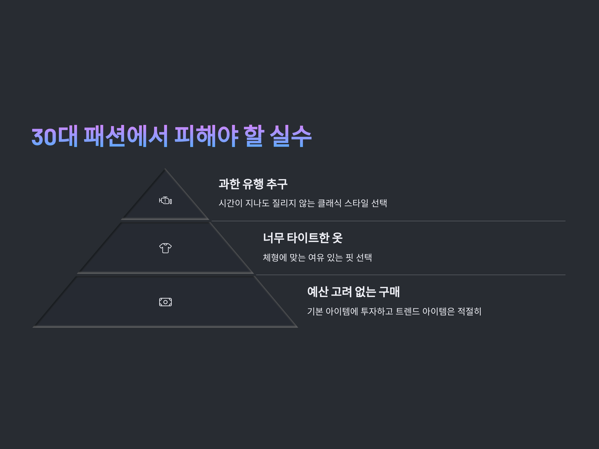 패션을 선택할 때, 특히 30대가 피해야 할 몇 가지 실수가 있습니다. 자신의 체형과 스타일에 맞지 않는 옷을 고르면 오히려 스타일을 망칠 수 있습니다. 또한 지나치게 유행을 따르거나, 너무 화려한 아이템을 선택하는 것도 피해야 합니다.