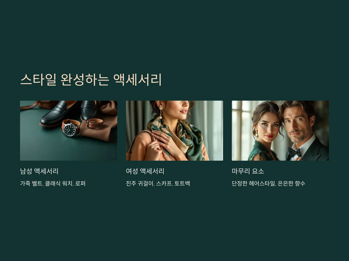 남성은 가죽 벨트, 클래식 워치, 깔끔한 로퍼 등으로 마무리하고, 여성은 진주 귀걸이, 스카프, 단정한 토트백으로 포인트를 주는 것이 좋습니다. 향수는 너무 강하지 않은 은은한 향으로 성숙한 이미지를 부각시켜줍니다.