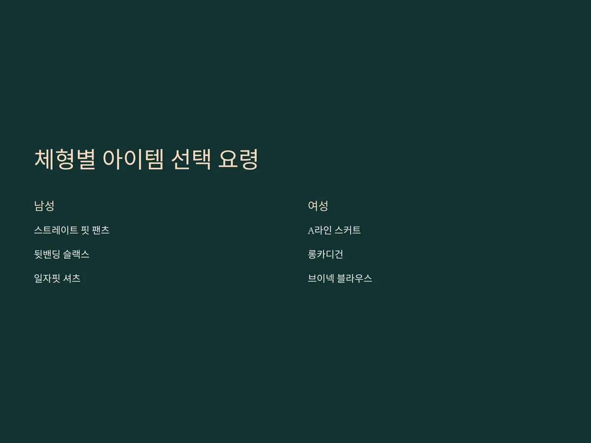 남성의 경우 허리라인이 드러나지 않는 스트레이트 핏의 팬츠나 뒷밴딩 슬랙스가 좋고, 셔츠는 일자핏이나 버튼다운 스타일로 편안하면서도 단정하게 연출할 수 있습니다. 여성은 A라인 스커트나 롱카디건으로 하체를 커버하고, 브이넥 블라우스로 목선을 강조해 전체적인 비율을 개선할 수 있습니다.