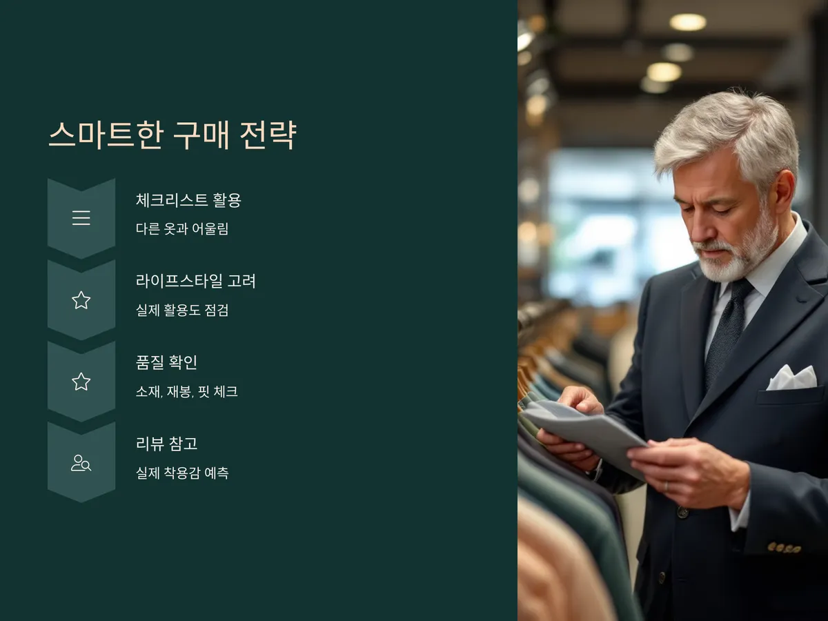 패션 쇼핑에서 가장 중요한 것은 무작정 사는 것이 아니라 계획적으로 구매하는 것입니다. 특히 50대는 품질과 실용성을 최우선으로 고려하며, 브랜드보다는 소재, 재봉, 핏 등을 꼼꼼히 체크하는 것이 좋습니다.