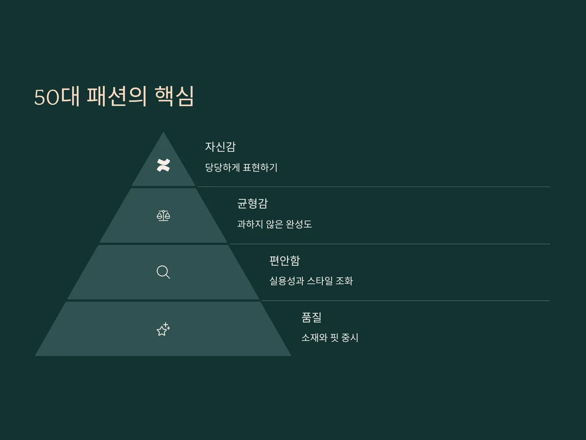 50대는 실용성과 편안함을 중시하지만, 그렇다고 스타일을 포기하지는 않습니다. 이 시기에는 지나치게 유행을 따르기보다는 자신에게 어울리는 옷, 체형을 보완해주는 스타일이 더 중요하게 작용합니다. 대표적인 50대 스타일은 클래식, 내추럴, 모던 캐주얼로 요약됩니다.