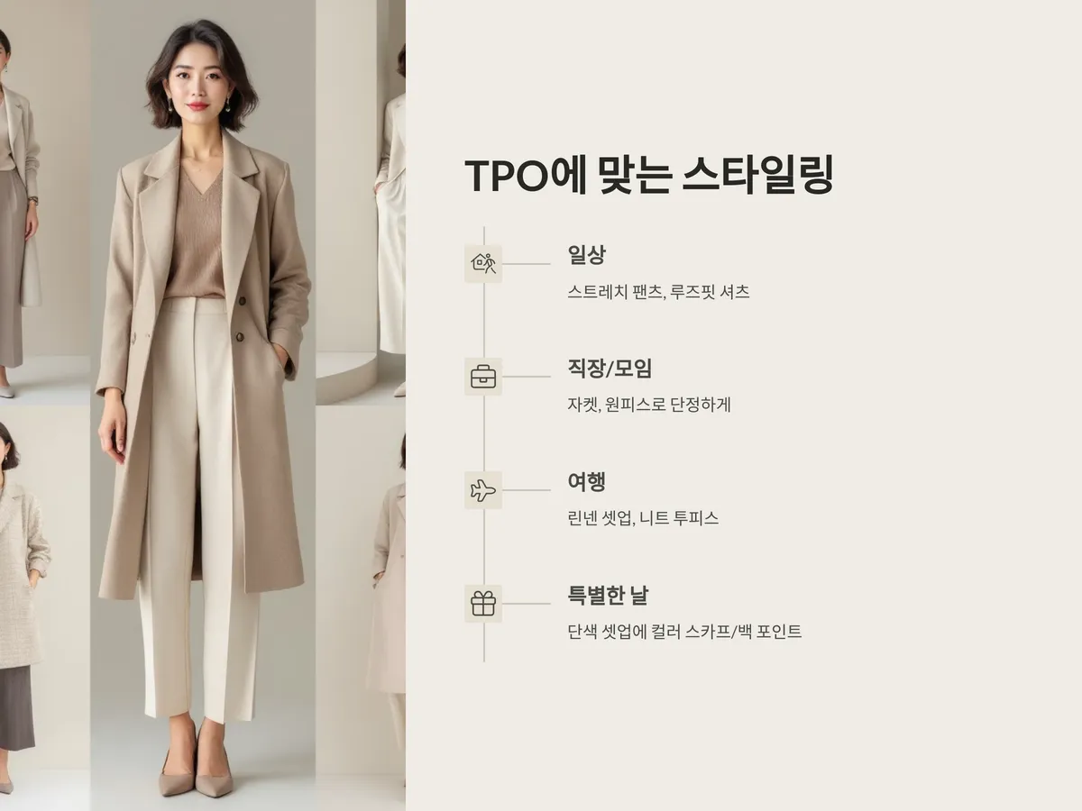 중요한 점은 어떤 TPO든 기본이 되는 베이스 스타일을 먼저 정하고, 그 위에 포인트를 더하는 것입니다. 예를 들어, 단색 셋업에 컬러감 있는 스카프나 백 하나만 더해도 전체 인상이 달라질 수 있죠. 상황에 따라 스타일을 바꾸되, 본인의 이미지와 자연스럽게 어우러지는 조화를 고려해야 합니다.