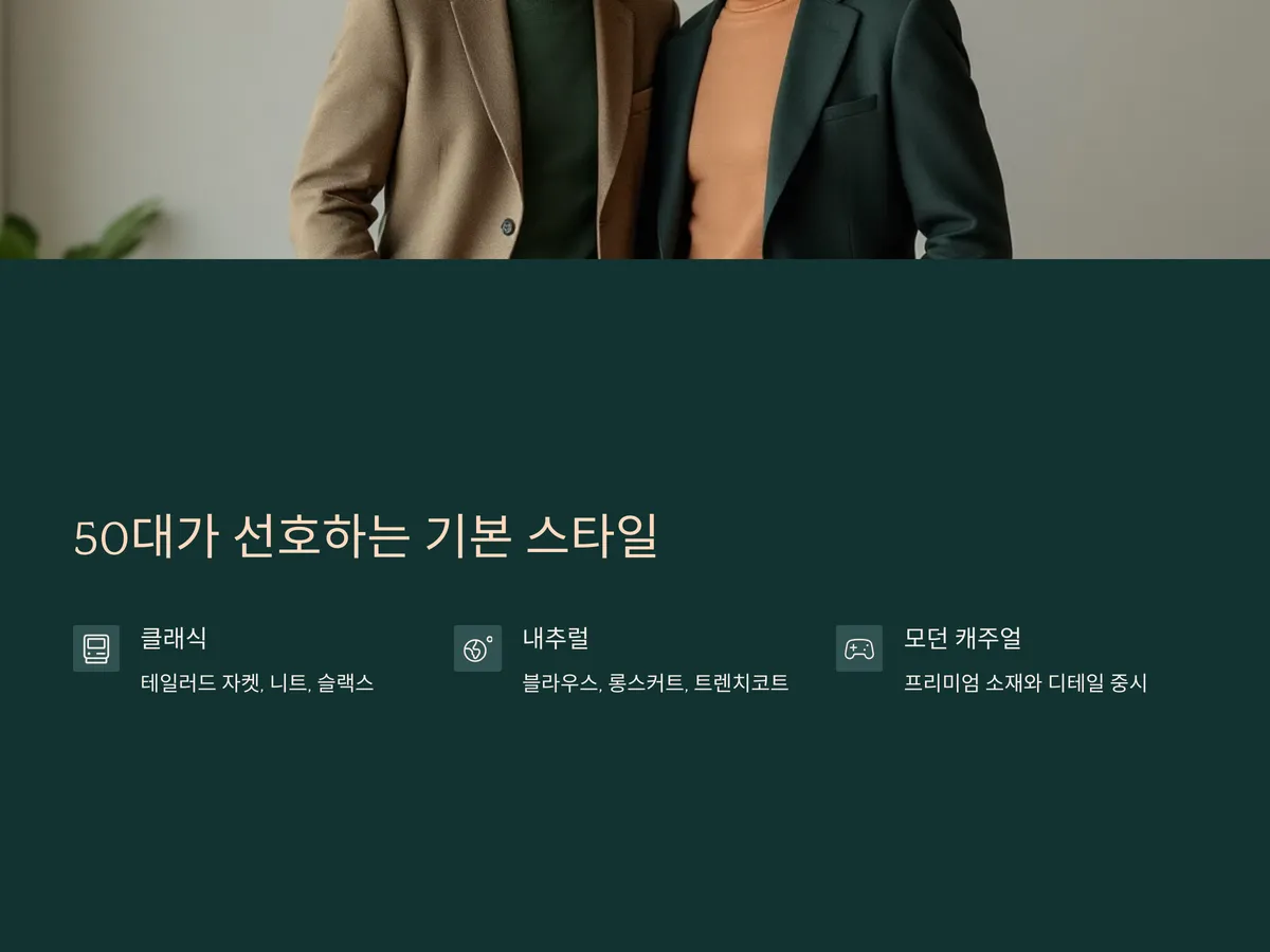 50대 스타일링에서 컬러 선택은 전체 인상을 결정짓는 중요한 요소입니다. 톤 다운된 뉴트럴 컬러—그레이, 베이지, 크림, 카키—는 자연스럽고 세련된 분위기를 연출하며, 얼굴을 밝아 보이게 합니다. 특히 쿨톤 피부라면 라이트 그레이나 소프트 블루가 잘 어울리고, 웜톤이라면 브라운이나 올리브 컬러가 좋습니다.