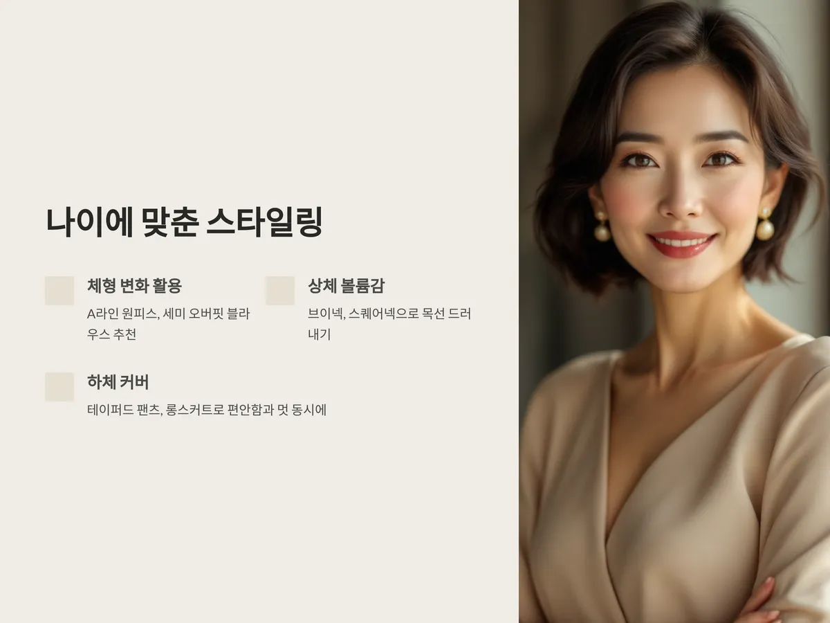 50대가 되면 자연스러운 노화와 체형 변화가 생깁니다. 이를 감추기보다는 나만의 매력으로 소화하는 것이 중요합니다. 예를 들어, 팔뚝이나 복부를 살짝 커버하면서도 전체 실루엣은 슬림하게 연출할 수 있는 A라인 원피스나 세미 오버핏 블라우스가 좋습니다. 지나치게 몸에 딱 맞는 옷이나 너무 펑퍼짐한 옷은 오히려 나이를 더 들어 보이게 하므로 피하는 것이 좋습니다.