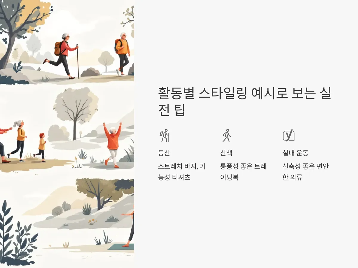 등산, 산책, 실내 운동 등 80대 어르신들이 자주 하는 활동에 맞춘 스타일링도 매우 중요합니다. 등산을 갈 경우에는 스트레치 기능이 있는 바지와 땀을 빠르게 말리는 기능성 티셔츠를 매칭하고, 산책용 레저룩에는 통풍성과 활동성을 높이는 셋업 트레이닝복이 효과적입니다.