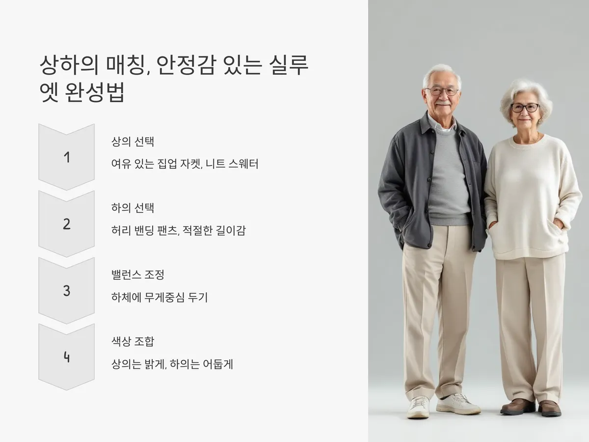 신체 밸런스가 변한 80대에게는 상체보다 하체에 무게중심을 두는 실루엣이 더 안정적인 인상을 주며, 허리 위로 적당한 높이의 상의를 착용하면 다리도 길어 보이게 만들 수 있습니다. 무채색 상하의보다는 상의는 밝게, 하의는 어둡게 코디하면 전체적으로 균형 잡힌 룩이 완성됩니다.