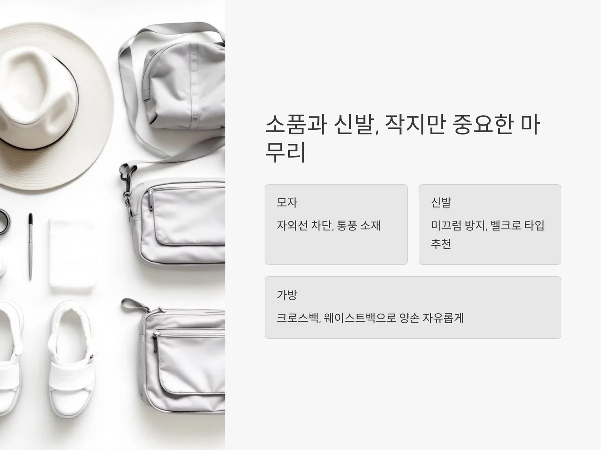 신발은 미끄럼 방지 기능과 쿠션감이 중요한데, 끈이 있는 운동화보다는 벨크로 타입이나 슬립온 형식이 더 편리하고 안정적입니다. 또한 크로스백이나 웨이스트백은 양손을 자유롭게 하여 안전한 외출에 도움이 되며, 작은 소지품을 챙기기에 용이합니다.