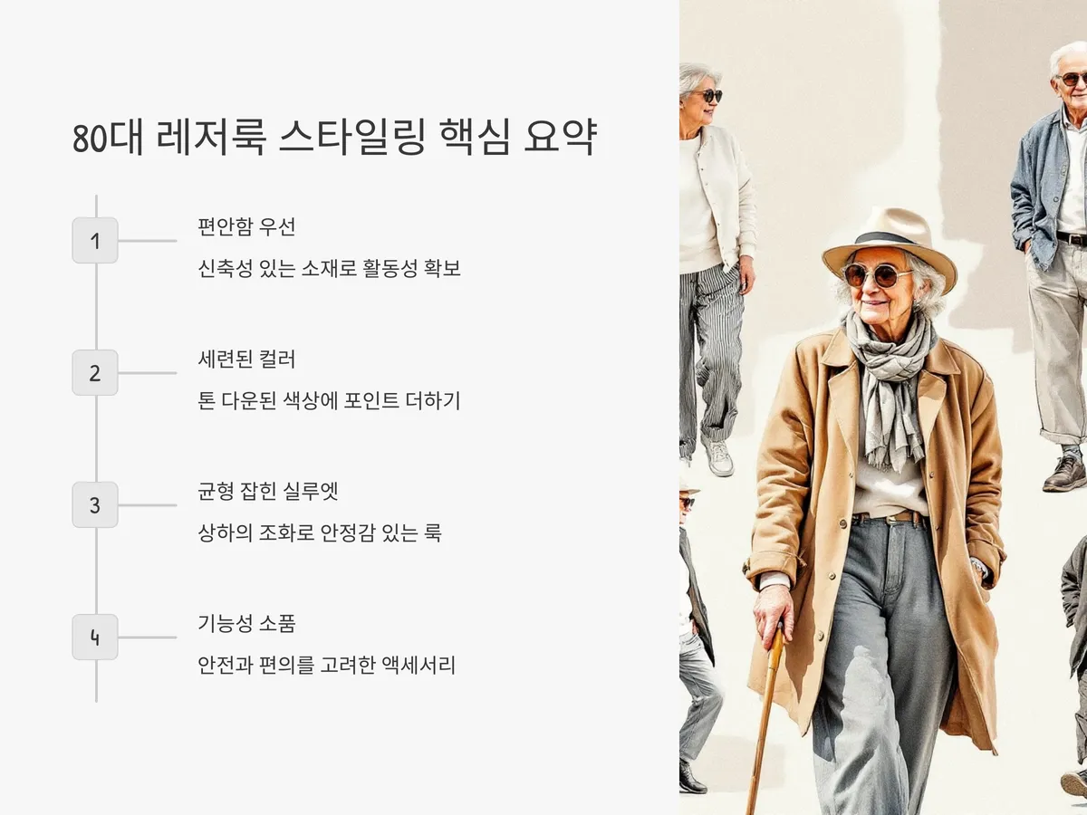 게다가 복지관이나 문화센터 등에서 이루어지는 다양한 활동 참여율이 높아지면서 ‘외출용 레저룩’에 대한 수요도 크게 증가하고 있습니다. 어르신들 사이에서도 ‘멋내기 문화’가 확산되며 자신을 표현하는 수단으로 패션이 자리 잡고 있죠. 이번 글에서는 80대가 입기 좋은 레저룩 스타일을 카테고리별로 살펴보고, 실생활에 바로 적용할 수 있는 꿀팁까지 공유해드릴게요.