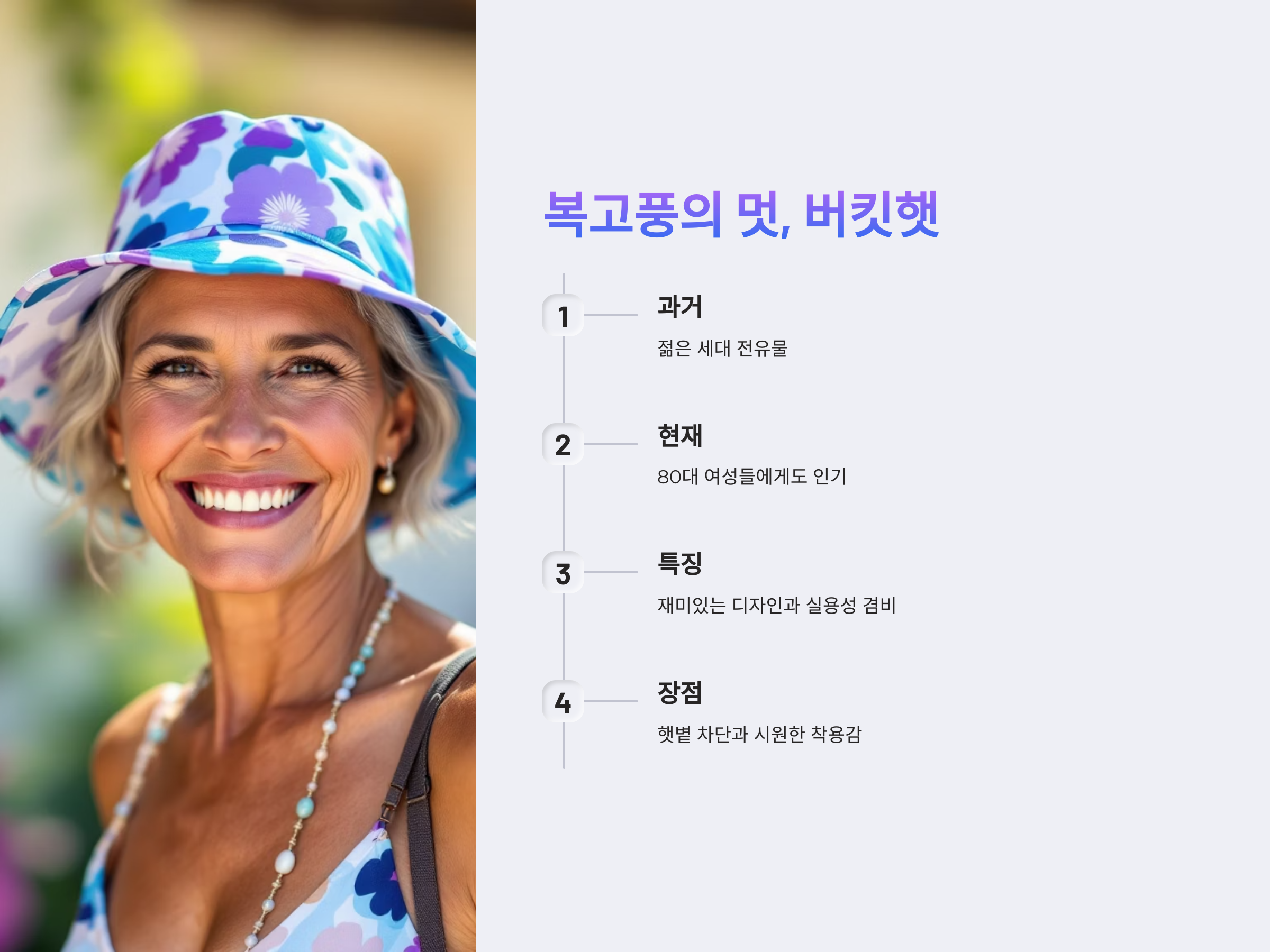 버킷햇은 80대 모자 트렌드 중에서 가장 큰 변화를 일으킨 스타일 중 하나입니다. 과거에는 젊은 세대들만의 패션 아이템으로 여겨졌지만, 이제는 80대 여성들 사이에서도 큰 인기를 끌고 있습니다. 버킷햇은 그 자체로 재미있는 디자인과 실용성을 겸비하고 있어, 다양한 연령층에게 어울리는 아이템입니다. 특히, 여름철에는 햇볕을 차단하면서도 시원한 느낌을 주는 모자여서 매우 유용합니다.