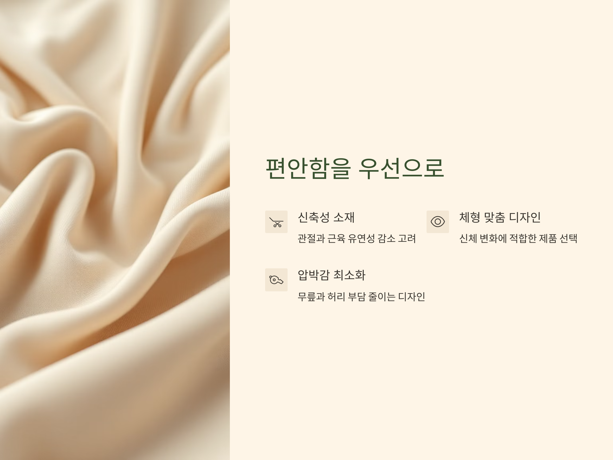 이때, 무릎이나 허리 부분을 압박하지 않도록 제작된 의류가 매우 유용합니다. 예를 들어, 고탄성 소재로 제작된 레깅스나 요가 바지, 또는 편안한 움직임을 돕는 스포츠 셔츠와 같은 의류가 적합합니다. 허리 부분은 특히 편안하게 조절할 수 있는 디자인으로 선택하는 것이 좋습니다. 부드러운 소재는 피부 자극을 최소화하고, 장시간 착용해도 불편하지 않게 해줍니다.
