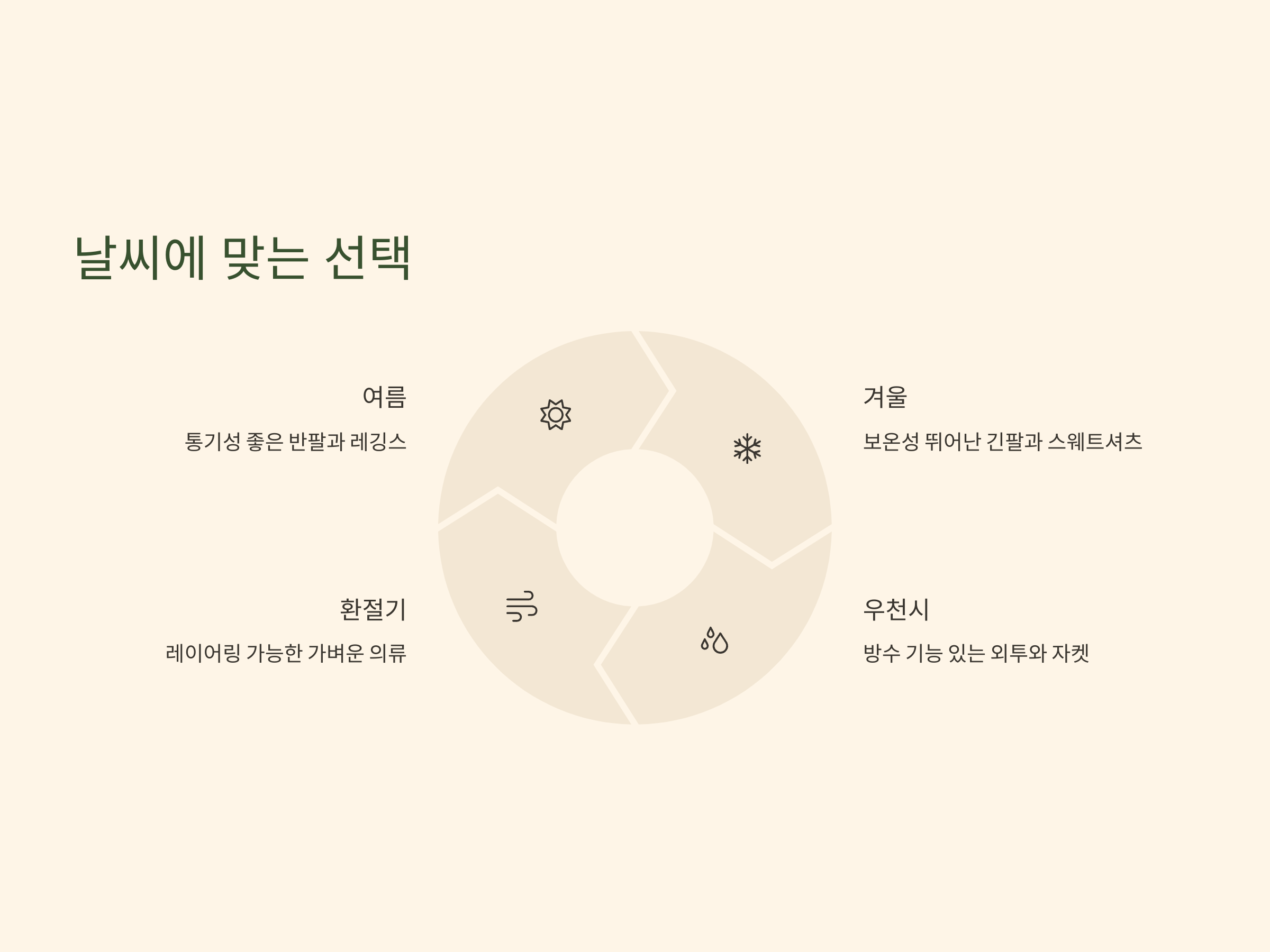 추운 날씨에는 보온성이 뛰어난 소재가 포함된 의류를 선택하는 것이 중요하며, 여름철에는 땀을 흡수하고 빠르게 건조되는 제품을 선택해 더욱 편안하게 운동을 즐길 수 있습니다. 또한, 비오는 날에는 방수 기능이 있는 외투나 자켓을 착용하여 운동 중 우천 상황에 대비하는 것이 좋습니다.